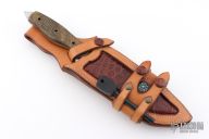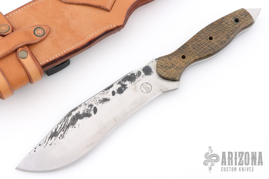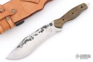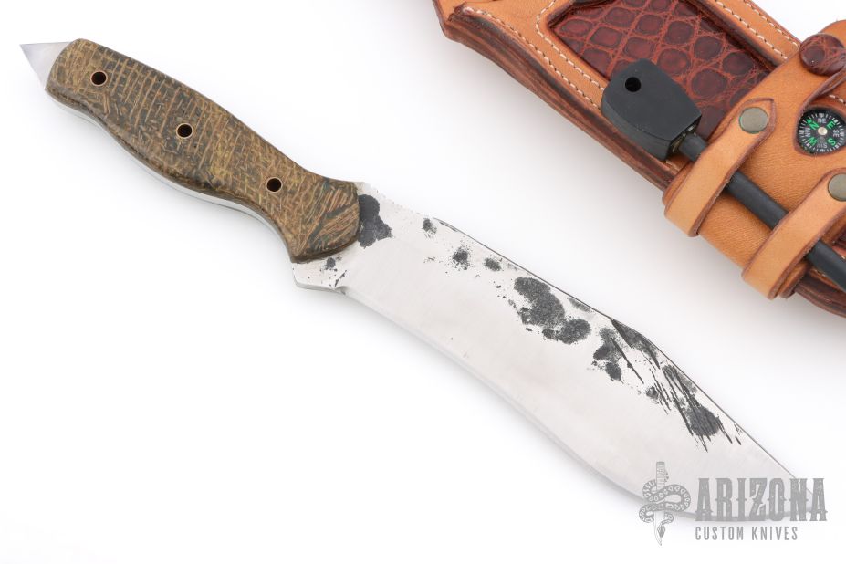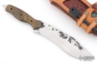 This Survival Series Chopper by Shane Gallagher features a hand forged and satin finished recurve blade with notched thumbrest, .203" blade stock and 2.020" blade depth, full tang construction. The handle has burlap micarta scales with copper tube pins, extended tang at the butt. Comes with a brown leather sheath with alligator skin inlay, firesteel and compass. Excellent condition.