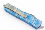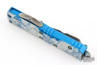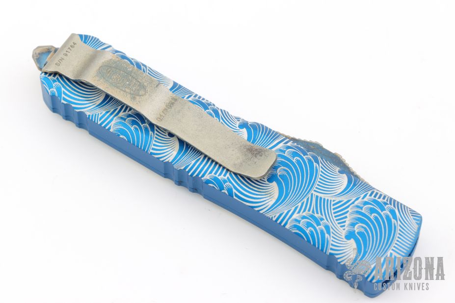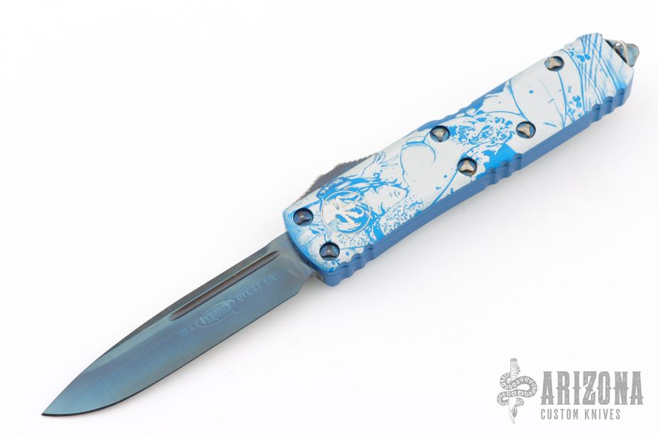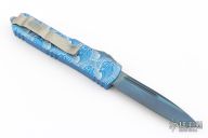 This UTX-85 by Microtech features a blue satin finished blade with fullers. The handle has a blue aluminum frame with blue hardware and tip down clip. Comes with original box. Dated 01/2023 and S/N 91764.  Includes the original box and papers. Has some light scratches, has some blue staining on the clip, otherwise good condition.