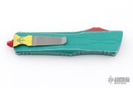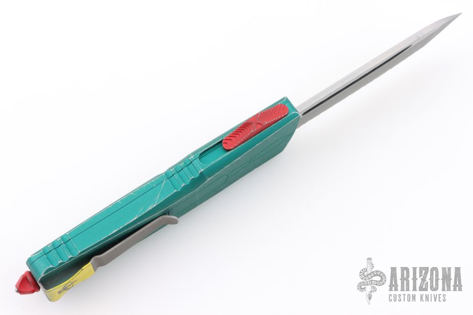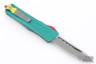 This Combat Troodon by Microtech features an Apocalyptic finished tanto blade with full serrated edge. The handle has a distressed green aluminum frame with red hardware and a tip down stainless steel clip. Comes with original box and papers. Dated 05/2022 and s/n 1951. Excellent condition.