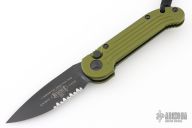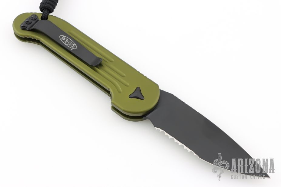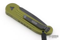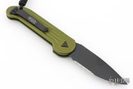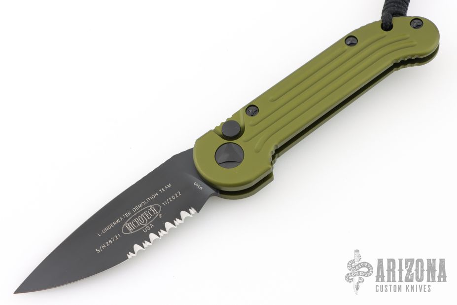 This LUDT side opening automatic from Microtech has a black finish blade with a partially serrated edge and a contoured OD Green aluminum frame. Stainless steel clip. Dated 11/2022 and serial number 28721. Comes with original box and papers. Excellent condition.