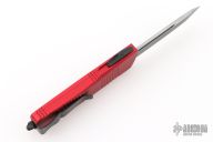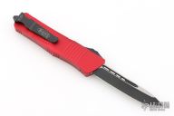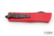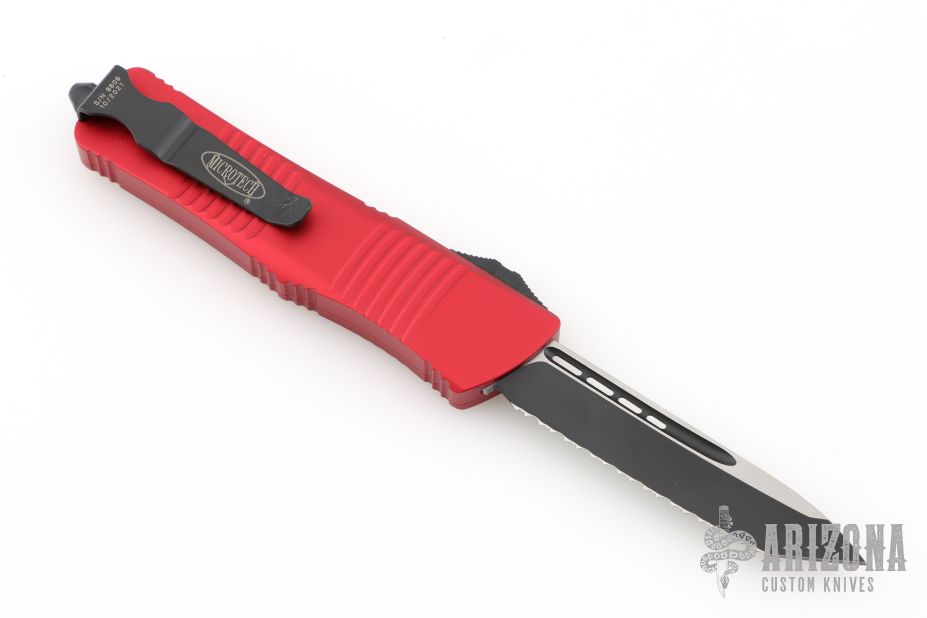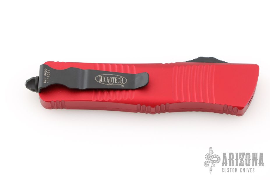 This Troodon automatic by Microtech knives features a black fully serrated blade with fullers. The handle has a red aluminum frame with thumb-slide and glass breaker, and tip down clip. Comes with original box and papers. Dated 10/2021 with a S/N of 8609. Excellent condition.