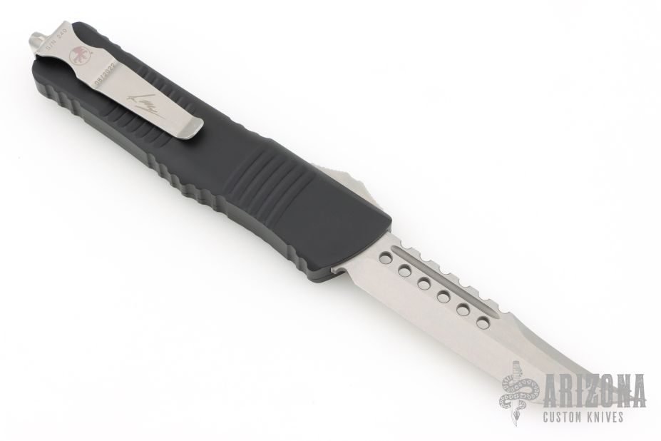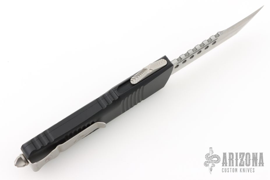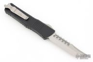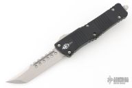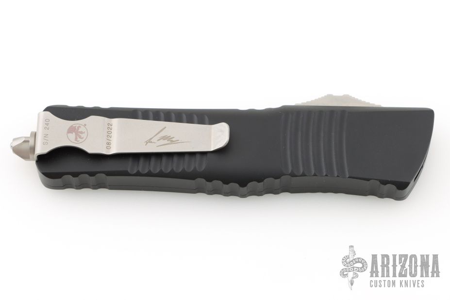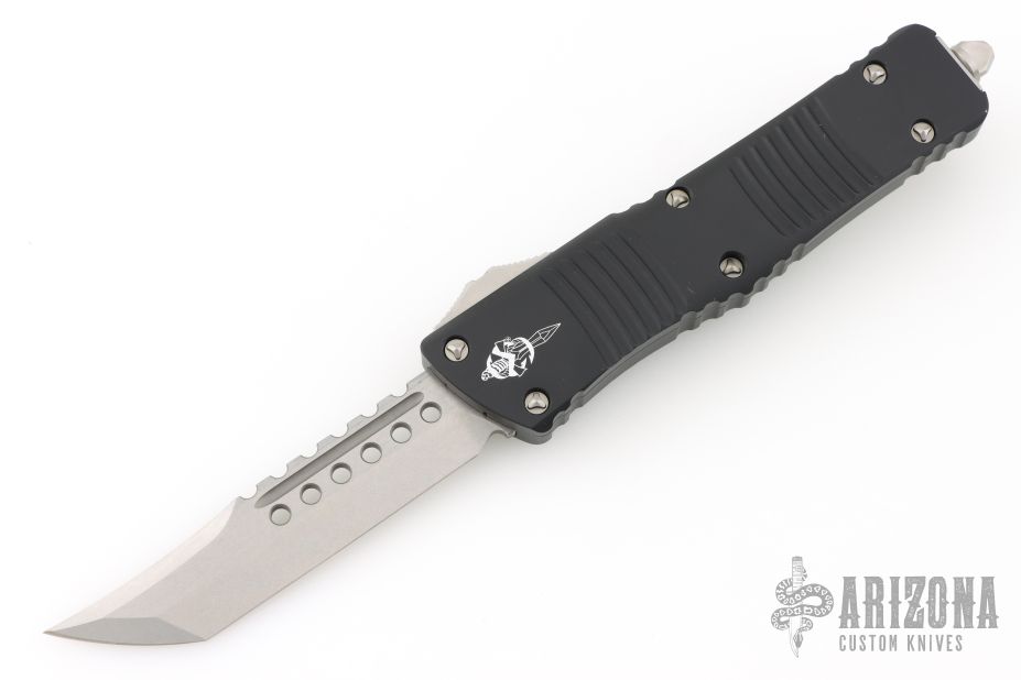 This Combat Troodon OTF automatic by Microtech knives features a stonewashed Hellhound tanto blade, and a black aluminum handle with bead blasted hardware, tip down carry. Glass breaker. Dated 08/2022 S/N 240. Excellent condition. Comes with original box and papers.