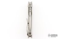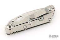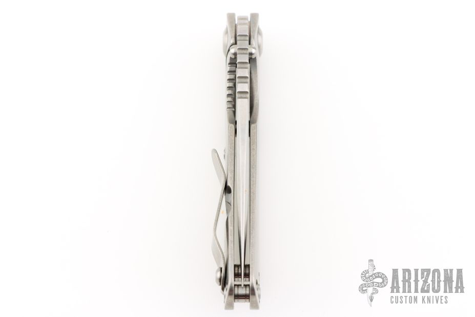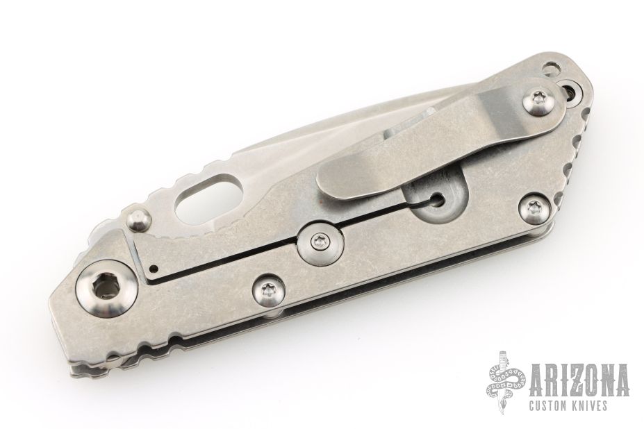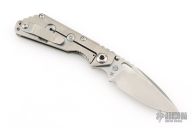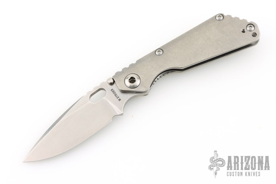This Mick Strider Performance series SNG framelock folder features a stonewashed drop point blade with thumbhole and notched thumbrest. The handle has a stonewashed titanium frame with titanium clip, tip up carry. Jimping on blade spine. Includes Hinderer "Lock Bar Stabilizer" for maximum reverse lock retention. Nice lockup, detent, and blade seating. New condition.