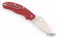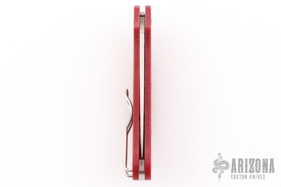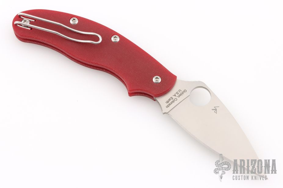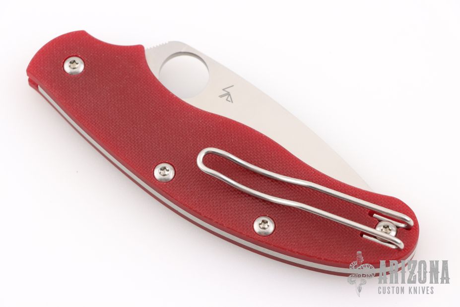This UK Pen Knife by Spyderco features a satin finished blade with thumbhole. The handle has red G-10 scales, stainless steel backspacer and tip up clip, left or right reversible. Comes with original box and papers. New condition.