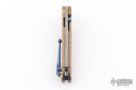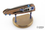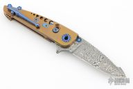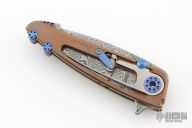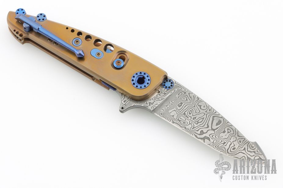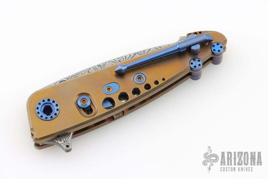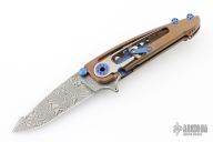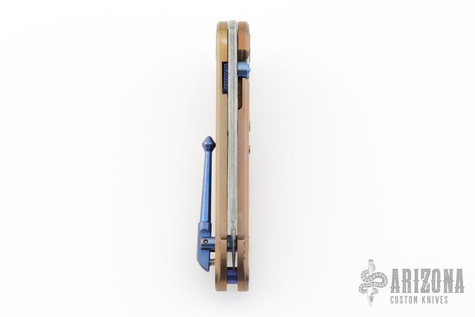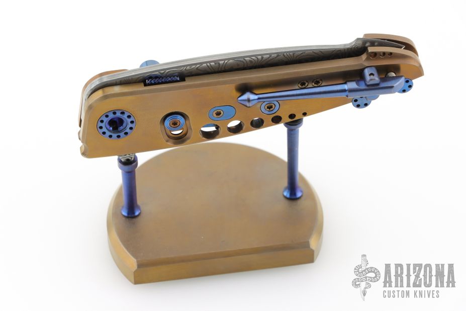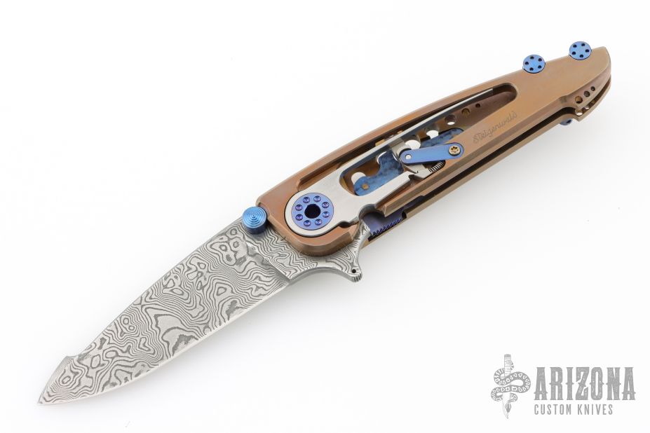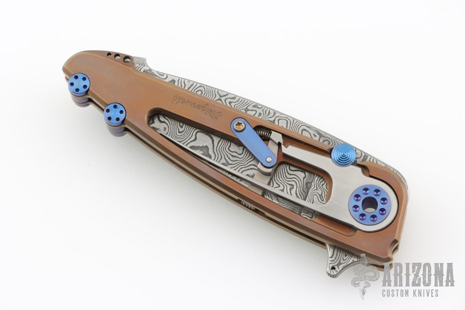 This Assist-i80 Steampunk Flipper by Stefan Steigerwald features a hand forged INOX Damascus blade with a notched flipper and a single anodized titanium tumbstud. The handle has a bronze anodized titanium frame, blue anodized titanium accents and hardware, bead blasted stainless steel assist spring that is visible in the middle of the handle. Has a round blue safety on the b-side of the frame that blocks the assisted feature. The assisted feature is on the spine of the handle, it opens the blade part way. Has an anodized titanium spring clip. Anodized titanium locking liner. Comes with original box, titanium display stand, and tools. Has a couple very light scratches, otherwise excellent condition. Comes with COA