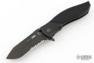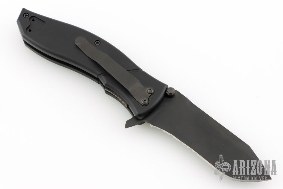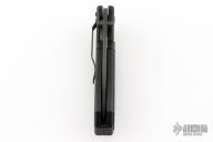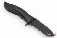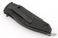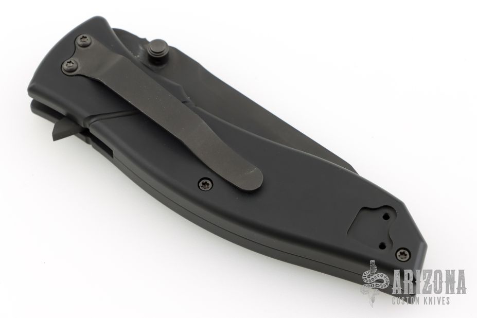 This Greg Lightfoot model Bullwhip Assisted opening flipper features a black recurve partially serrated blade with dual thumbstuds and a flipper. The handle has a black milled aluminum frame. Black stainless steel tip down reversible clip. Comes with nylon zippered case and original box and papers. Excellent condition.