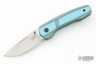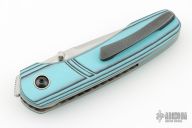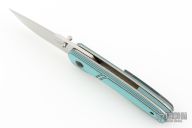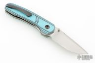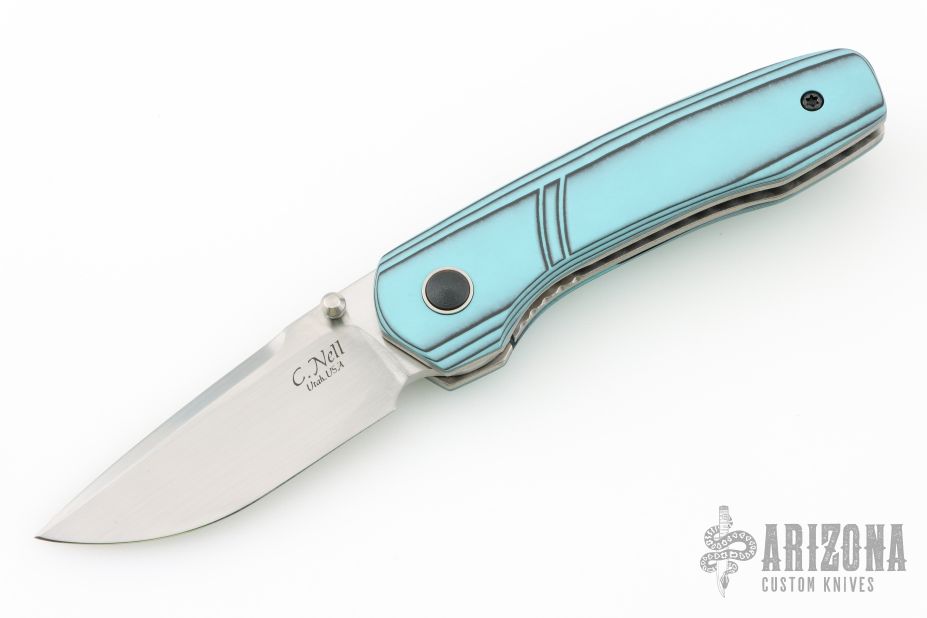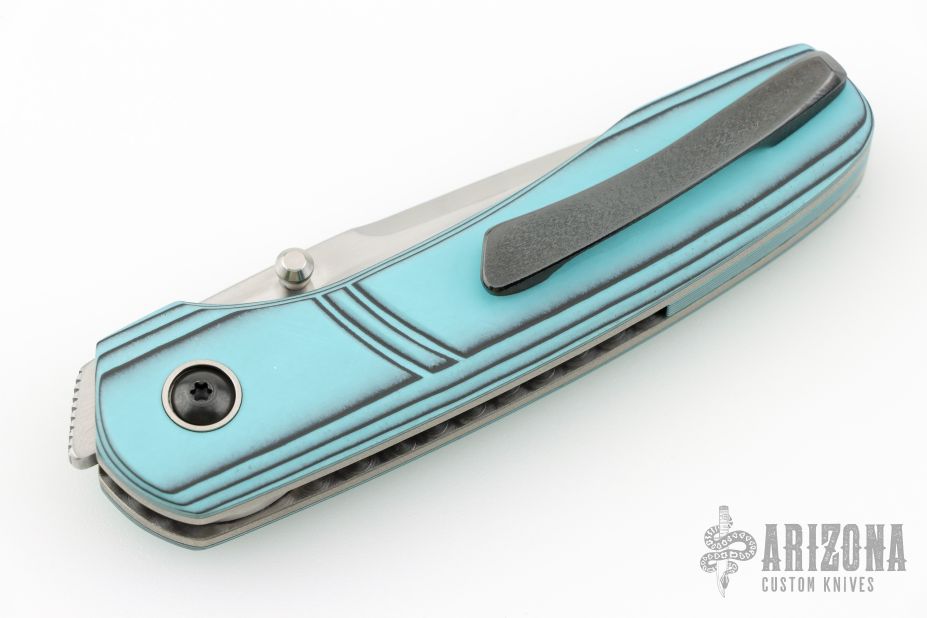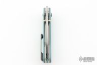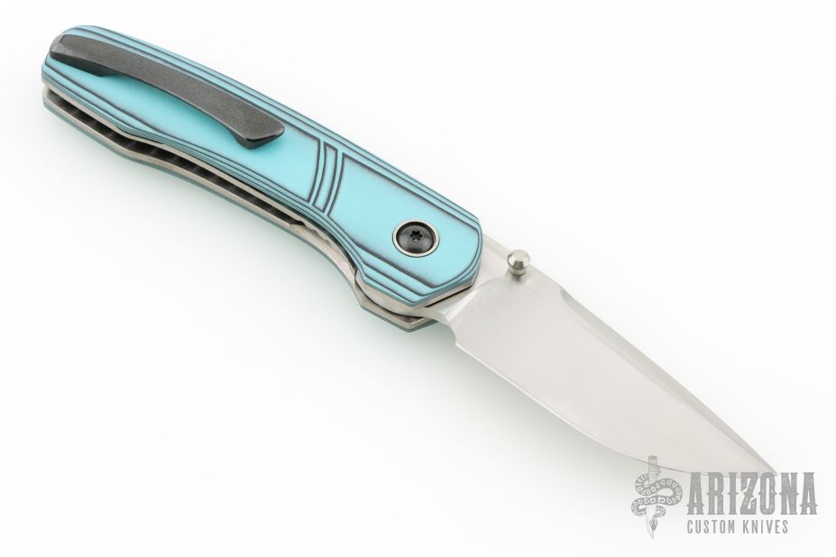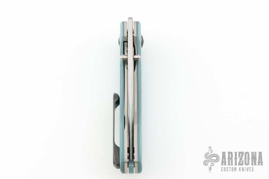 This knife by Chad Nell features a hand rub satin finished blade with false top edge dual thumbstuds. The handle has Brittany Camoquartz covers, blasted titanium liners with jeweled interiors, titanium pivot collars, zirconium inlay in pivot, zirconium tip up clip, and matching camoquartz backspacer. Rides on bearings, nice detent, lockup and blade seating. Comes with maker's zippered case and COA dated 9/25. New from maker at the 2025 Blade Show West!