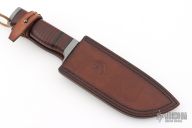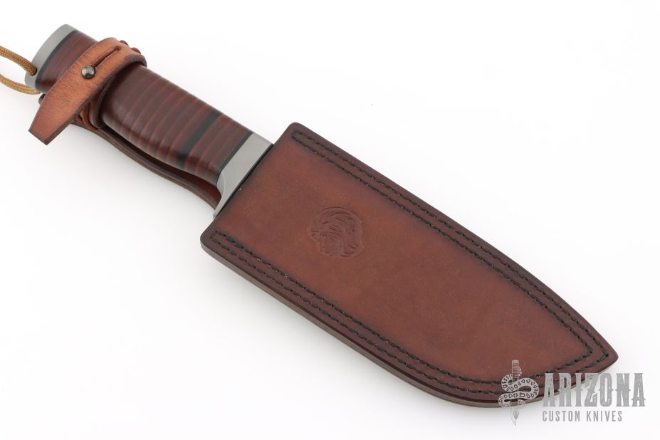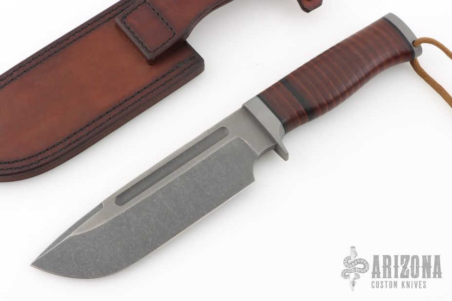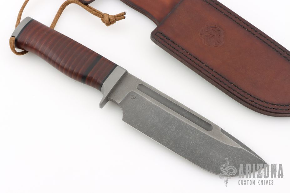 This Aldo by Petr Weingartner features a clip point blade with false top edge, fullers and notched thumbrest, .205" blade stock and 1.781" blade depth, hidden tang construction. The handle has a steel guard and butt cap with a beeswax infused stacked leather grip.  Includes a brown leather sheath and COA dated 9/3/25. New from maker.