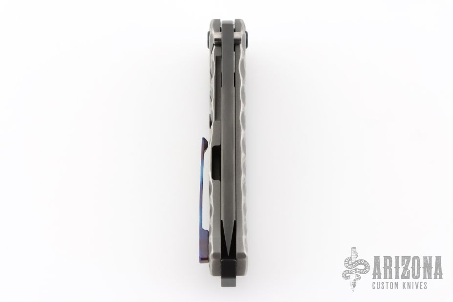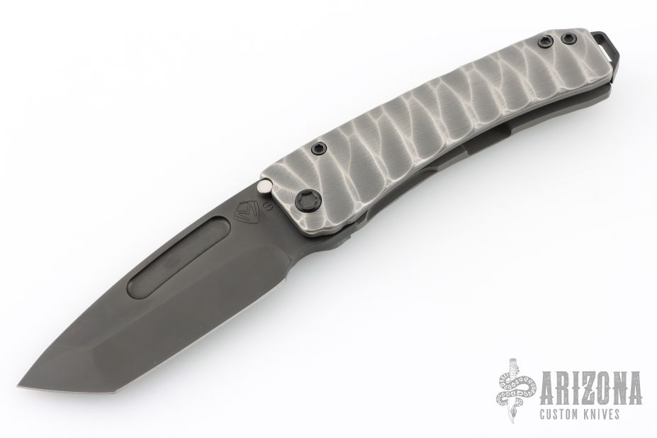 This Midi Marauder from Medford Knife and Tool features a Vulcan finished drop point style blade with fullers.  The handle has a bead blasted and brushed silver "Predator" frame, with exposed lanyard bail in backstrap. Excellent detent, lockup, and seating. Original box, hard case and papers dated June 16, 2022. Excellent condition.
