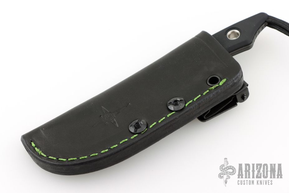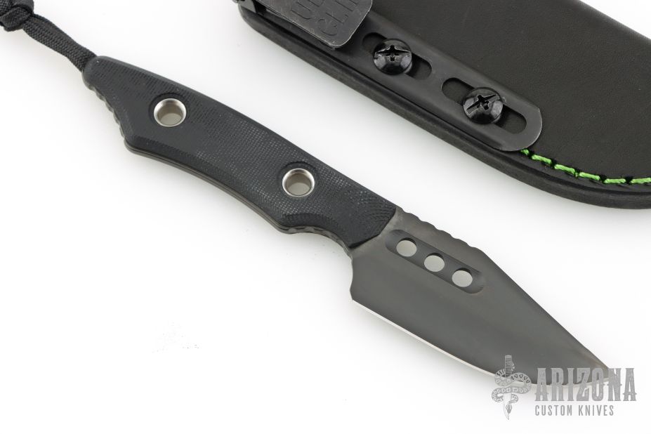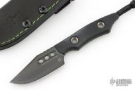 This Kobold fixed by Heretic Knives features a Bowie DLC clip point blade with notched thumb rest, fullers, .1" Blade stock, 1.064" Blade depth with full tang construction. The handle is comprised of black G10 covers with lanyard bail in pommel. Comes with original box, leather sheath and ulticlip. S/N 00092. New from maker at the 2025 Blade Show West!