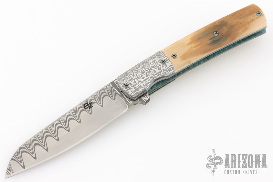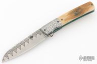 This FR Stretch Flipper by Brad Zinker features a Baldur Damascore blade with checkered thumbrest and flipper. The handle has dovetailed Ladder Damasteel bolsters, mammoth ivory scales, anodized titanium liners with laser engraved interiors and a tip up anodized titanium clip. Rides on bearings, nice detent, lockup and blade seating. Comes with zippered case. Excellent condition.