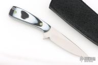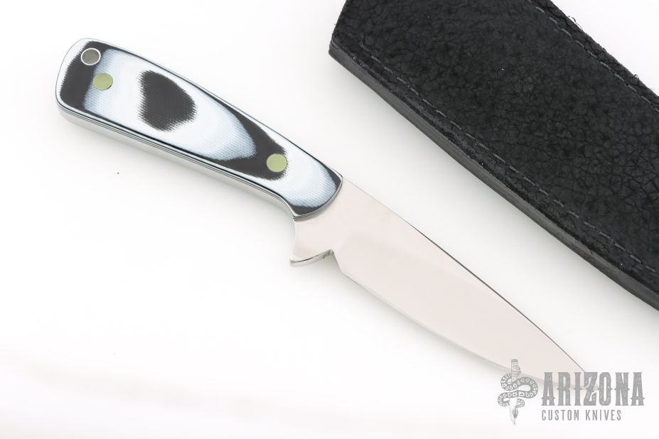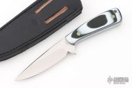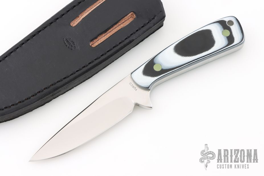 This knife by Mickey Yurco features a satin finished drop point blade with .212" blade thickness and 1.030" blade depth, full tang construction. The handle has black/whiteG10 scales with green pins and lanyard hole in pommel. Comes with a leather belt sheath. New from maker at the 2025 Blade Show West!