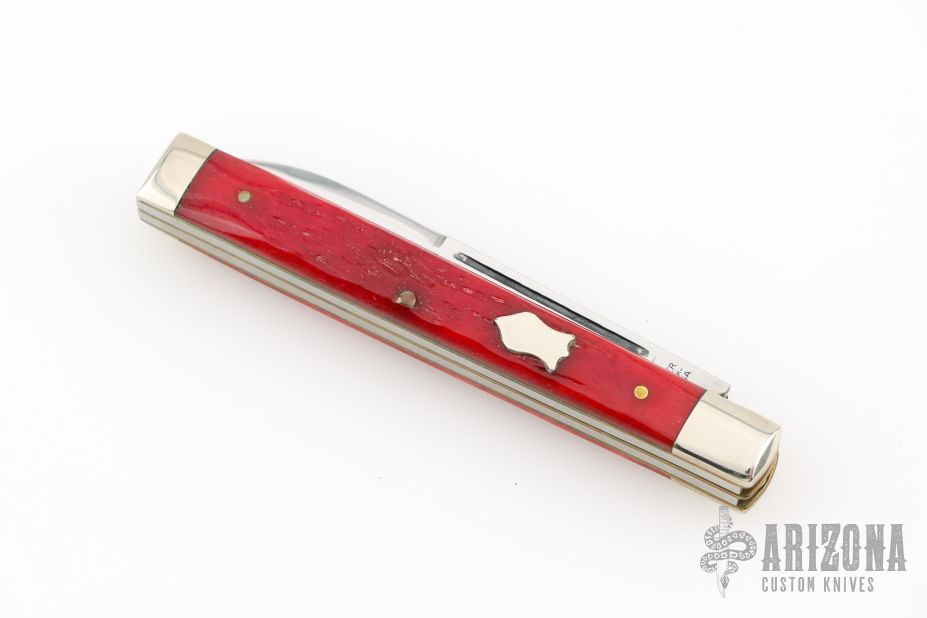 This doctors knife by Winchester features mirror polished blades with nail nicks, nickel silver bolsters and red jigged bone covers with a nickel silver shield, brass liners and stainless steel springs. Excellent Condition.  Comes with Winchester box.