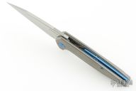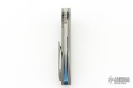 The Koenig Mini-Goblin 3 inch folding pocket knife is a collaboration between Edison Barajas of Sharknivco and Koenig Knives. The Mini-Goblin features a 3 inch burnished w/ PF blade with notched thumbrest and flipper. The handle has a PCF pattern titanium frame with an anodized titanium backspacer, pivot and hardware. Titanium tip up clip with hidden screws. Comes with original box and card dated September 24, 2025. New condition.