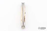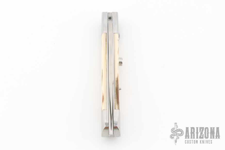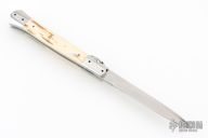 This ringpull auto by Burn Knives features a satin finish blade with false top edge, and .189" blade stock. The handle has polished stainless steel bolsters front and rear, liners and backspacer, Mammoth Ivory scales. Comes with a COA dated 12-30-20. Has a couple very light scratches, otherwise excellent condition. Comes with a zippered case.