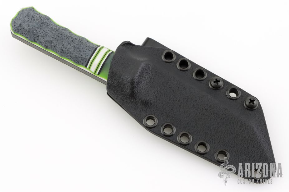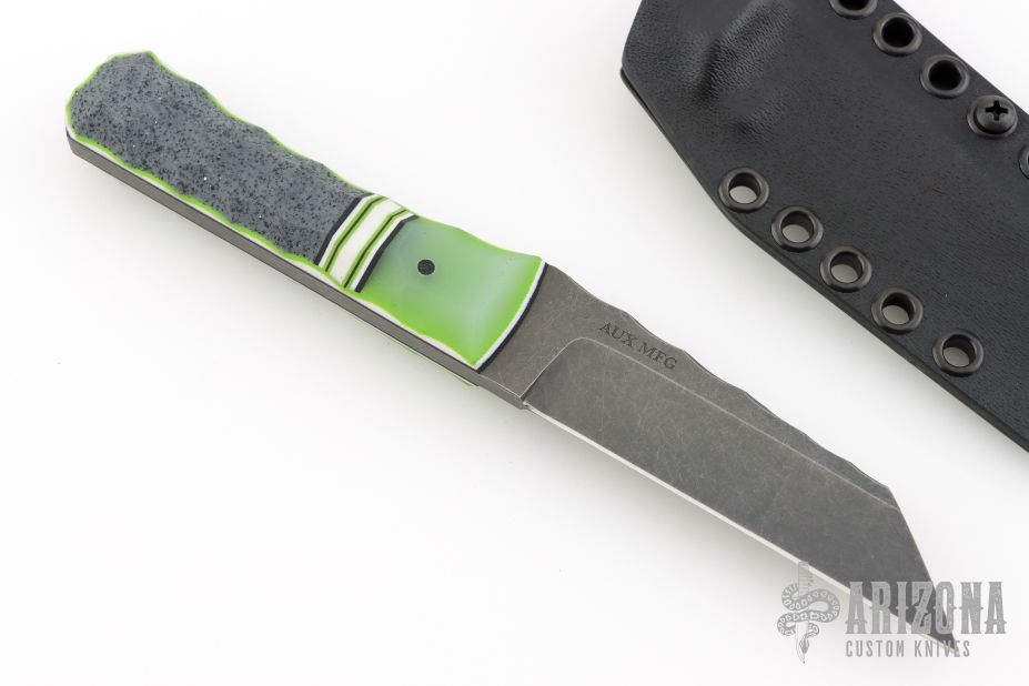 This REV by Auxiliary Manufacturing features an acid tumbled blade with textured spine, .195" blade stock and 1.030" blade depth. The handle has white/green/black scales. Comes with original box, and kydex sheath with clip. New from maker!