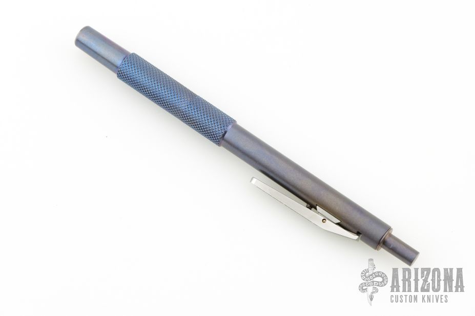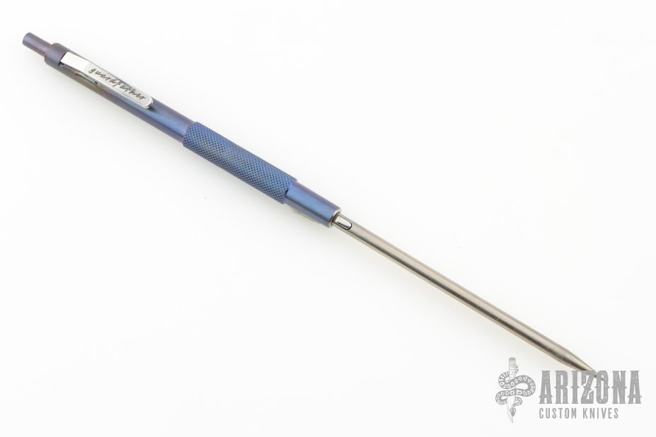 This Guardfather OTF Auto Spike features an anodized titanium spike blade. The handle is anodized titanium pen body with anodized titanium clip. This is a Homage to the original Guardfather OTF Spike auto. Comes in a bag. Excellent condition.