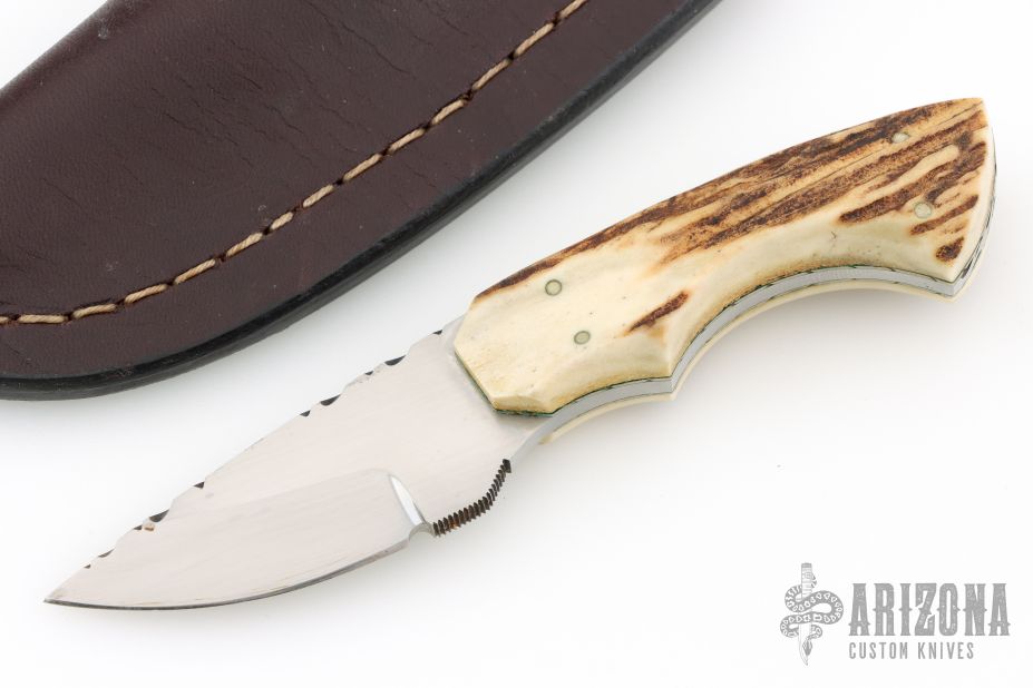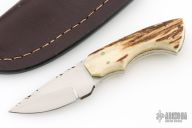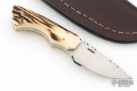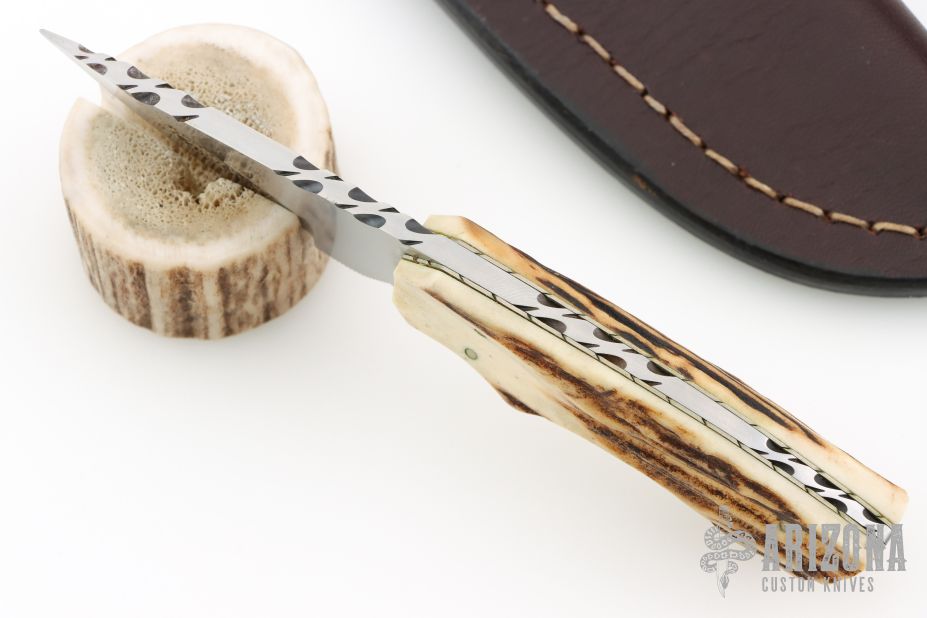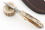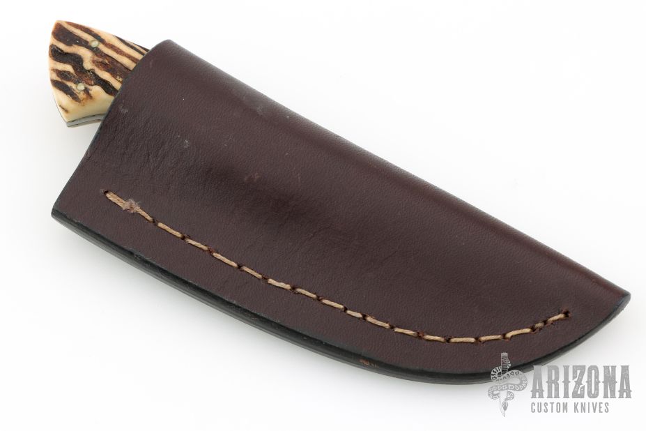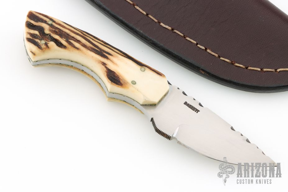 This knife by Gene Baskett features a hand rub satin finished blade with fileworked spine, .179" blade stock and 1.123" blade depth, full tapered tang construction. The handle has stag scales with nickel silver pins, nickel silver fileworked liners, fileworked tang. Comes with a brown leather sheath. Has a couple light scratches, otherwise excellent condition.