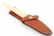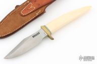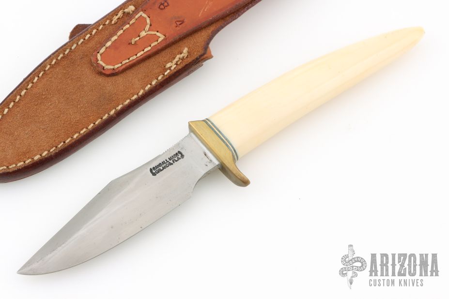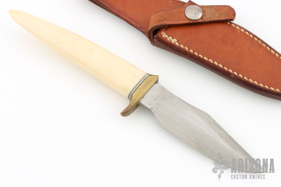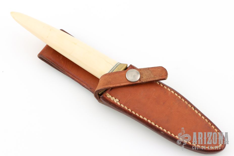 This Model 8-4 by Randall Made Knives features a satin finished blade with sharpened top edge and notched thumbrest, .152" blade thickness, 1.101" blade depth, hidden tang construction. Especially suitable for small fish and feathered game. Brass guard and a walrus tusk grip with white/blue spacers. Comes with a brown leather sheath. Has two small cracks in the handle near the guard, has some light scratches and some small oxidation spots, otherwise good condition for its age