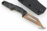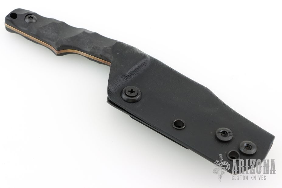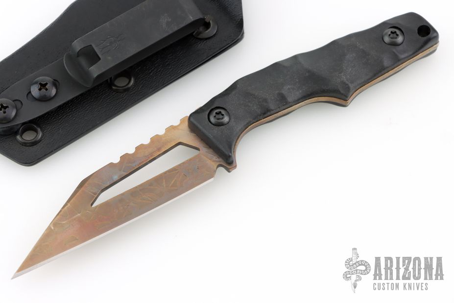 This Stark V2 by Bawidamann Blades features an acid etch patina finish on the blade, has notched thumbrest, .104" blade stock and 1.015" blade depth, full tang construction. The handle has IM Bawidamann Chunked Pattern Carbon Fiber scales (proprietary Carbon fiber composite). Comes ready to carry with the Bawidamann Uberscabbard. Excellent condition.