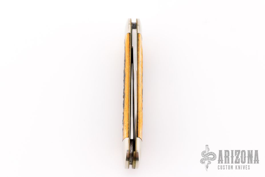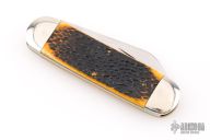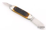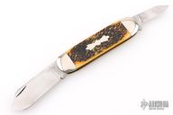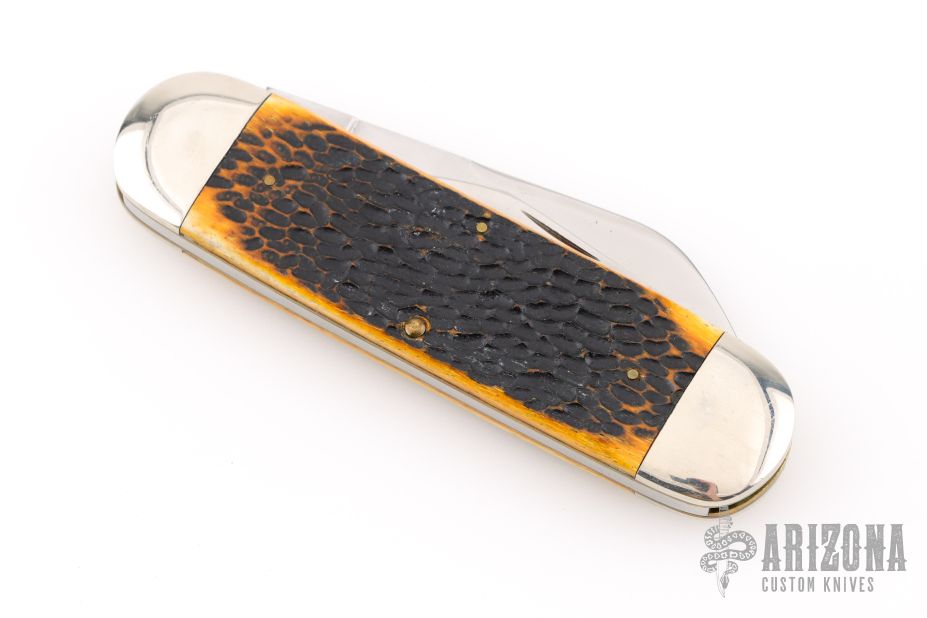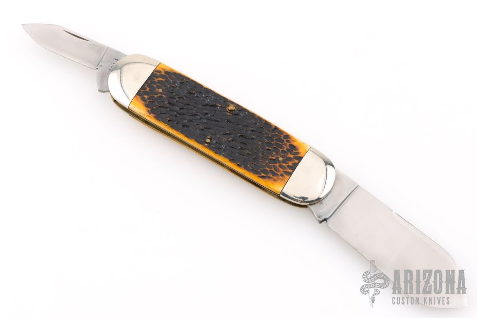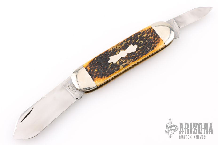 This Large Sunfish by Queen features satin polish finished blades with nail nicks.  The handle features nickel silver bolsters, brass liners and jigged bone covers. Stainless steel springs. Has some scuffs and scratches, great condition otherwise.