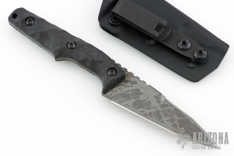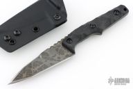 This Thick Huginn EDC by Bawidamann Blades was named after Odin’s Raven. It features an acid etched "black mirror" finished blade with sharpened top edge notched thumbrest, .158" blade stock and 1.208" blade depth, full tang construction. The handle has IM Bawidamann Chunked Pattern Carbon Fiber scales (proprietary Carbon fiber composite). Comes ready to carry with the Bawidamann Uberscabbard. Excellent condition.