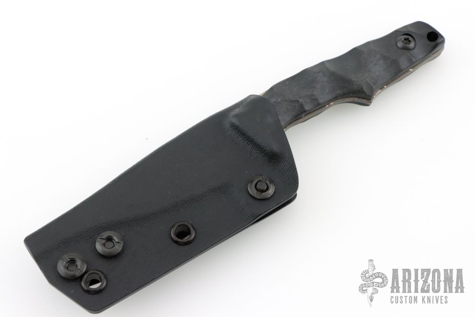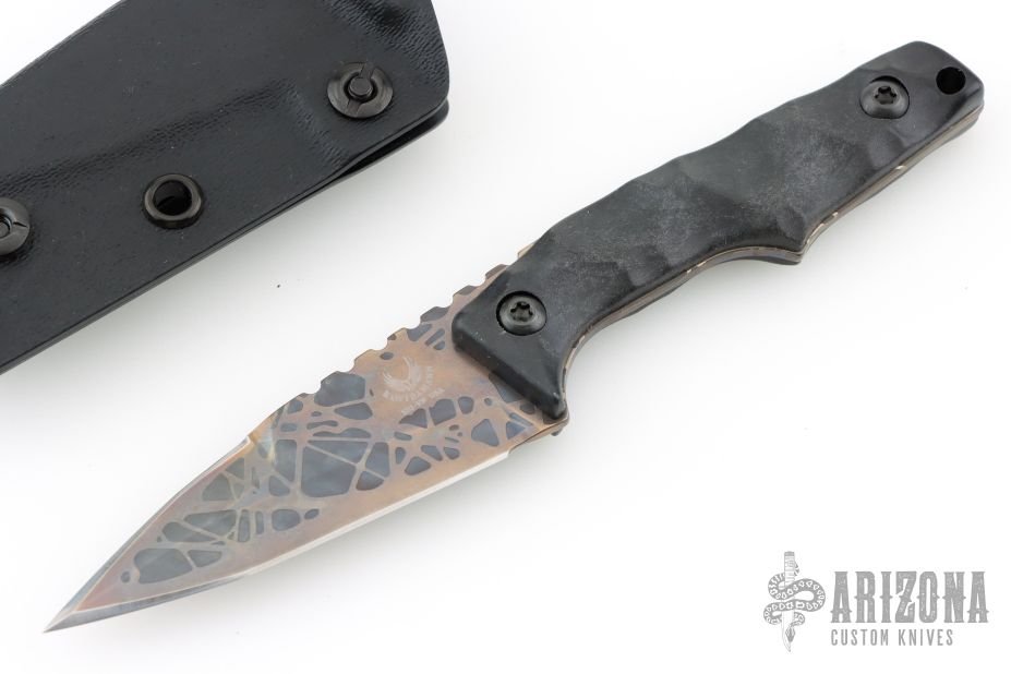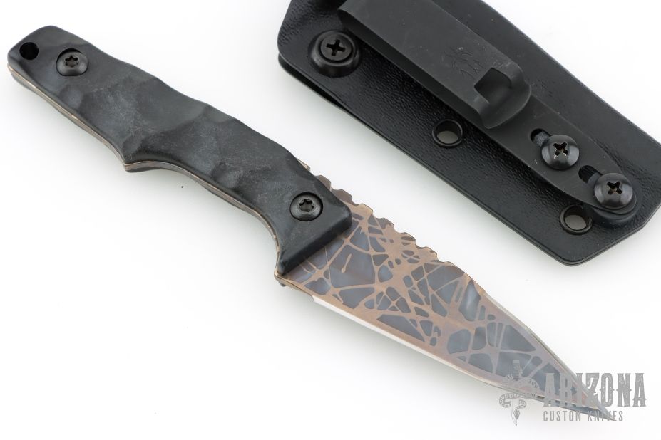 This Muninn Dagger by Bawidamann Blades was named after Odin’s Raven. It features a bronze patina acid etched blade with notched thumbrest and sharpened top edge, .100" blade stock and 1.085" blade depth, full tang construction. The handle has IM Bawidamann Chunked Pattern Carbon Fiber scales (proprietary Carbon fiber composite). Comes ready to carry with the Bawidamann Uberscabbard. Excellent condition.