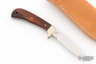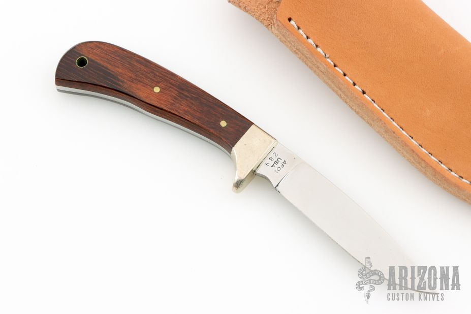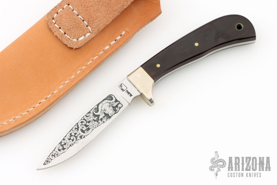 This knife by Alcas Knives and Aurum Etchings features a mirror polished drop point blade with etching, .121" blade stock and .669" blade depth, full tang construction. The handle has a nickel silver guard and wood scales with brass pins and lanyard hole. Comes with a brown leather sheath. Excellent condition. #289