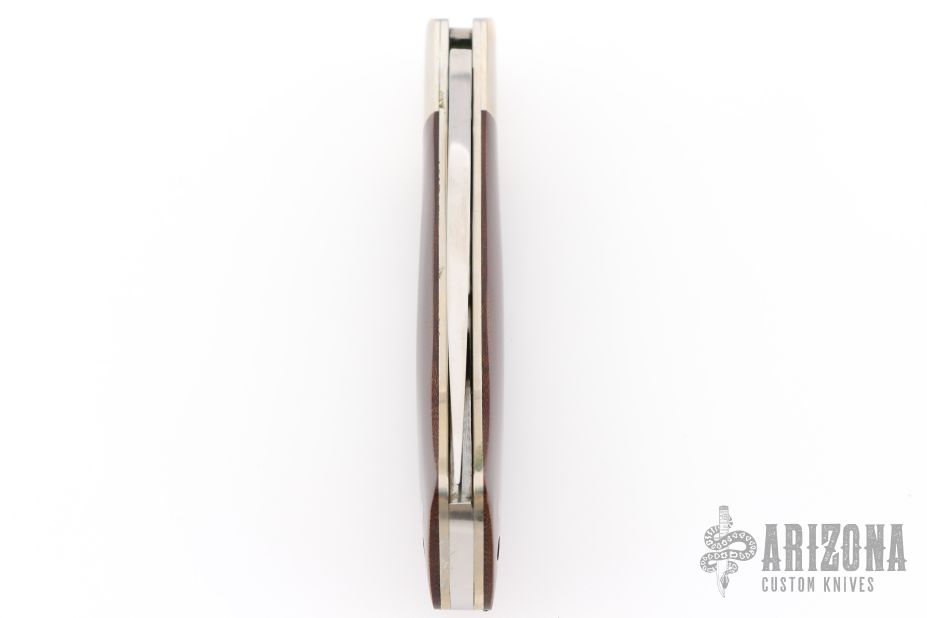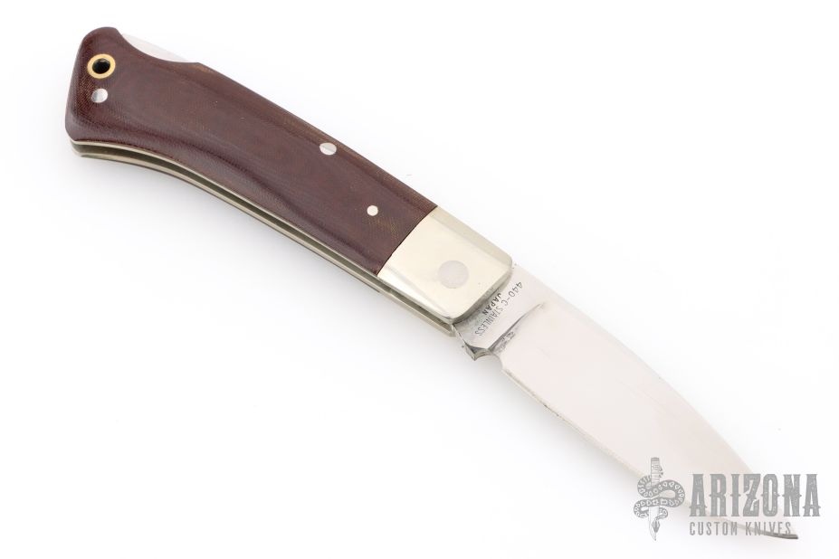 This lockback by Edge Mark has satin finished blade with nail nick. The handle has nickel silver bolsters, micarta scales, brass liners, stainless steel rockerbar. Has some light scratches, otherwise excellent condition. Comes with original box.