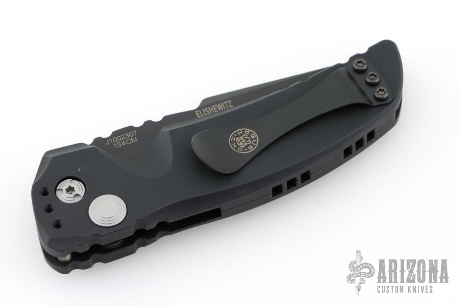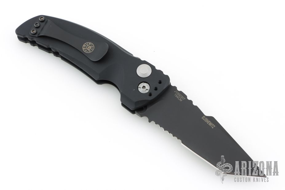 This EX-A01 by Hogue Knives is an Allen Elishewitz design, it features a black tanto partially serrated 154CM blade with notched thumbrest. The handle is black aluminum, tip up or down reversible black stainless steel clip. Has safety. Excellent condition.