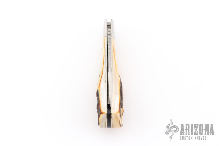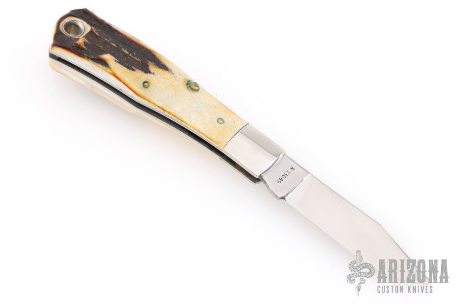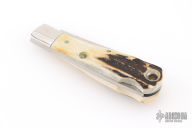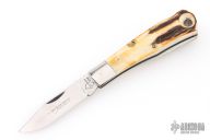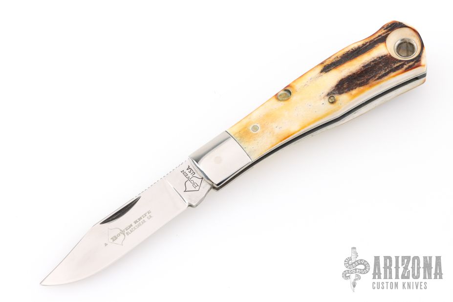 This Remington Bullet from Bowen USA features a mirror finished blade with nail nick and notched thumbrest. The handle has nickel silver bolsters, stag covers, nickel silver liners and stainless steel backspacer. Comes in a box. Has a couple light scratches, excellent condition.