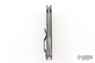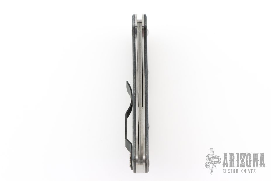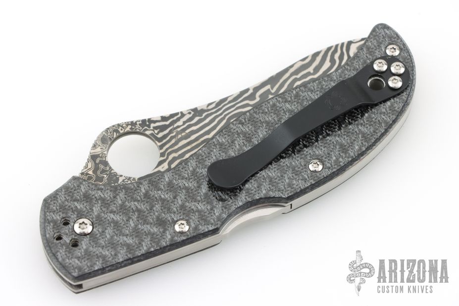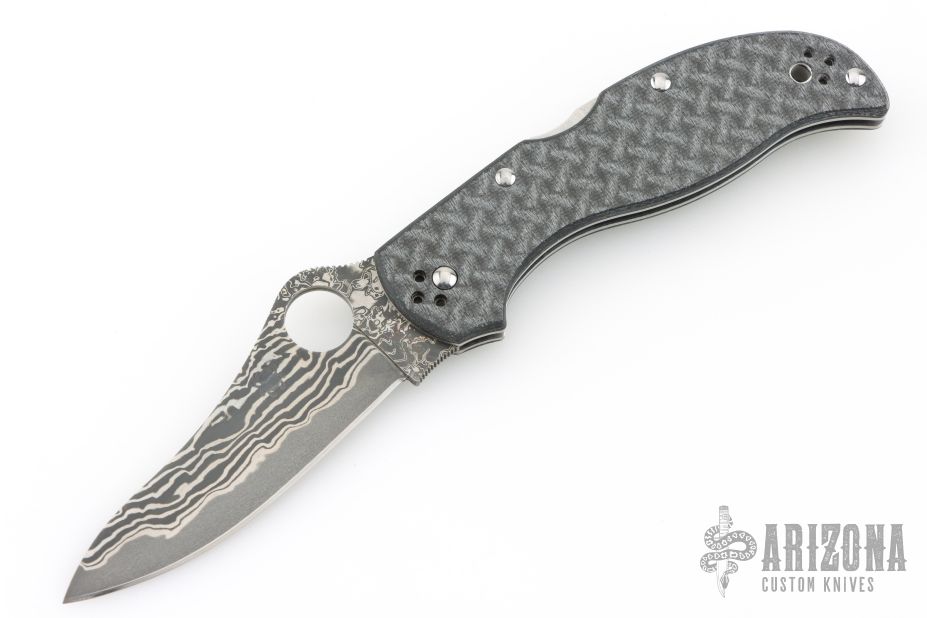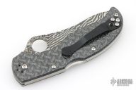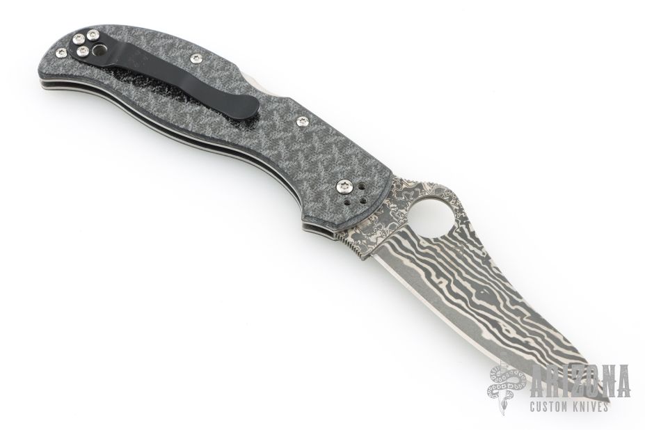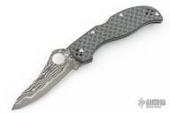 This Stretch Lockback Folder has a Damascus with VG-10 Core drop/ spear point blade with thumb hole and notched thumb rest. Handle is black Nishijin carbon fiber over stainless steel (lock) back spacer, and 4-way reversible stainless steel clip. Comes with original box and paperwork. New Condition.