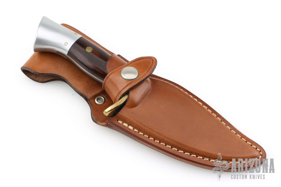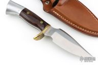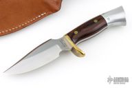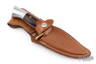 This knife by Westmark features a satin finished blade with false top edge, .176" blade stock and 1.489" blade depth, 3/4 full tang construction. The handle has a brass guard and pins, aluminum butt cap, dymondwood scales. Comes with original box, papers, and sheath. Has some verdigris on the brass portions. Excellent condition. #08025