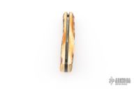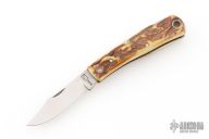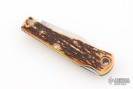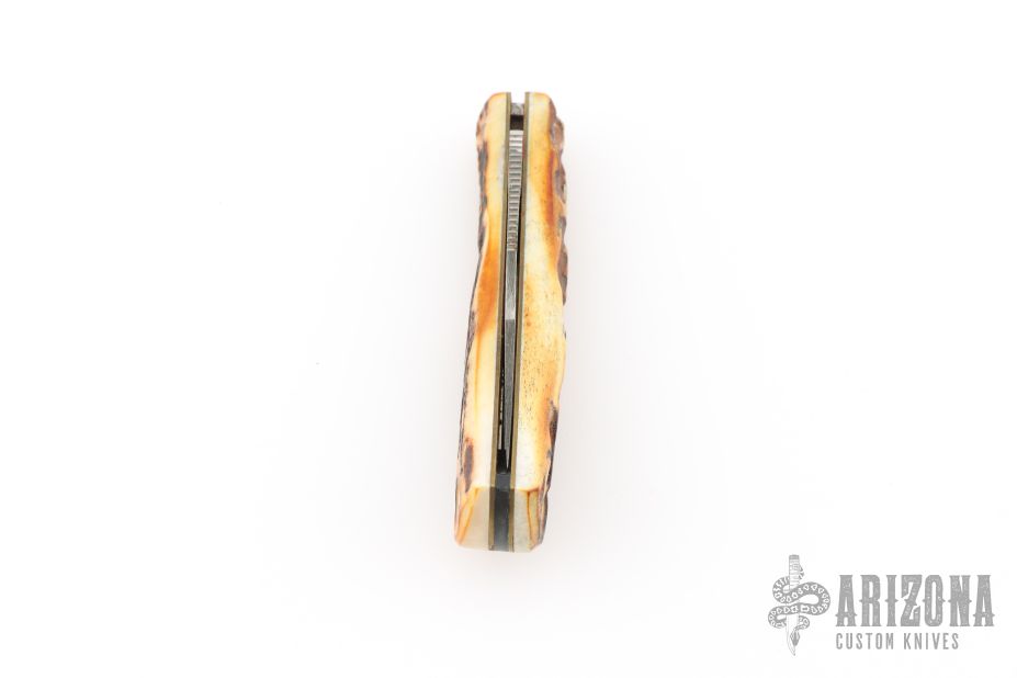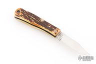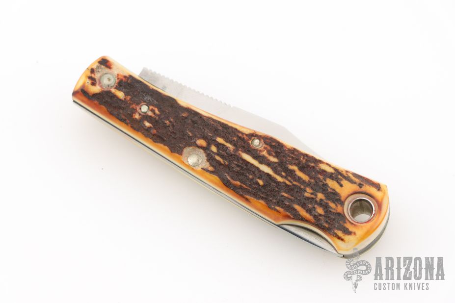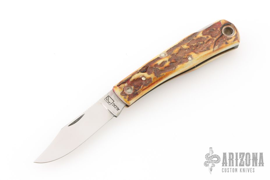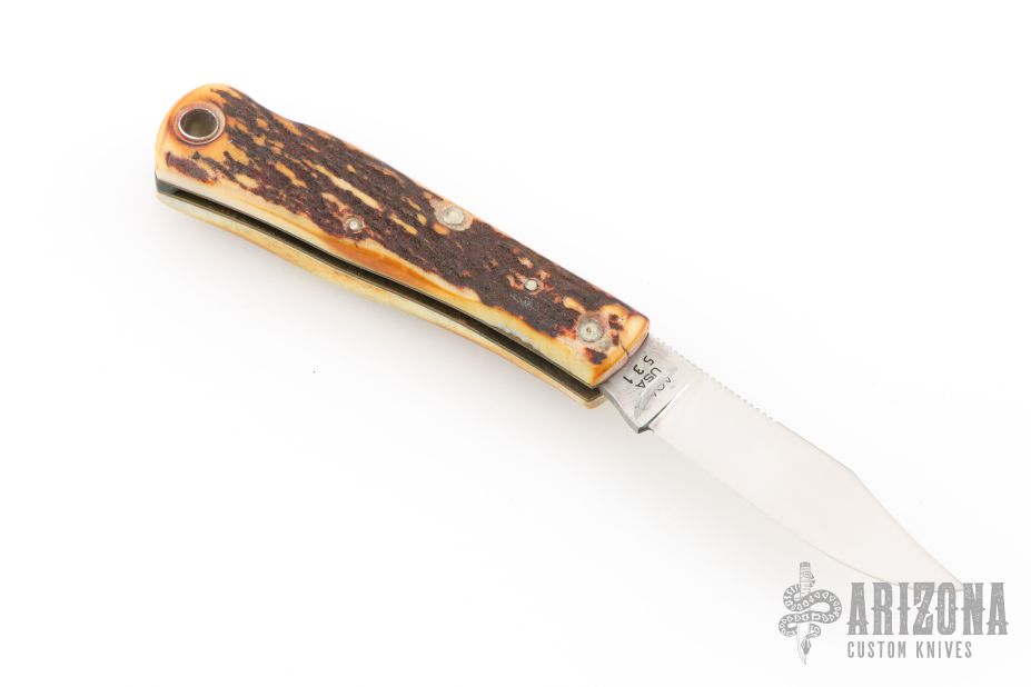This A04 Lockback from Alcas features a mirror polished blade with nail nick and notched thumbrest. The handle has nickel silver bolsters, stag scales, brass liners and stainless steel backspacer. Comes in a soft pouch. Has some scratches, otherwise great condition. #531