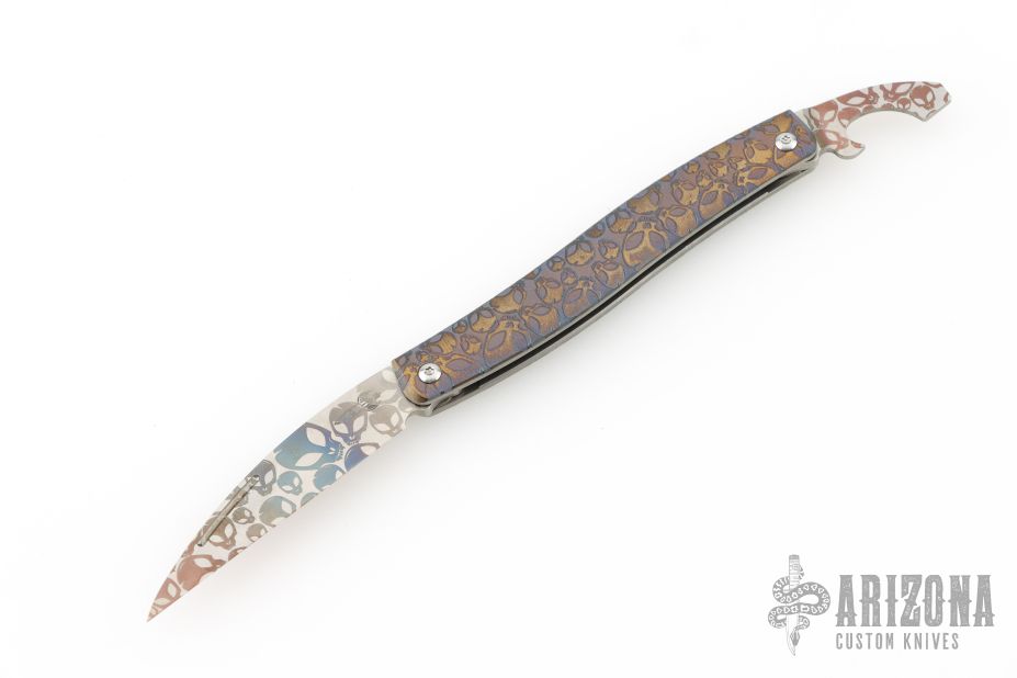 The Curved Slipjoint is a classic folding knife with a modern edge. Featuring a slip joint design, it offers a compact 3 3/8-inch closed length and a sharp 2 1/4-inch main blade. With the added versatility of a built-in bottle opener, this multifunctional tool is a perfect addition to any EDC collection. Also comes with a small blade to replace the bottle opener if you want. Comes with original box. New from maker. This one has been custom laser engraved by Black Widow Knife Works.