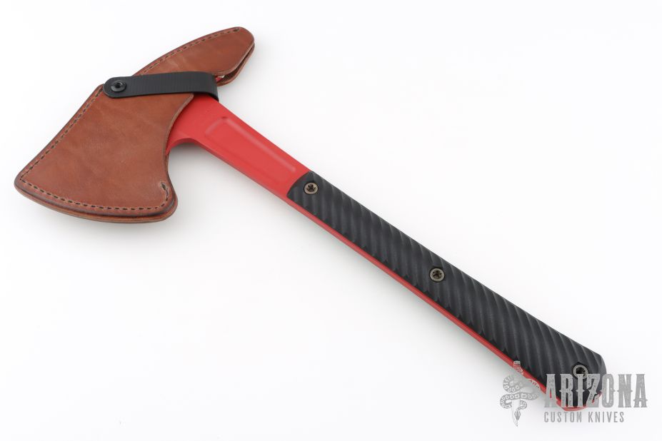 The Knight Hawk is a full tang tomahawk made from 80CRV2 carbon steel that is .273" thick and has a Rockwell hardness of 57-58.  It features 3D contoured black G10 handle scales that are permanently mounted for durability.  The head, from the forward edge to the end of the spike, is 6 3/4" long and has a 2 7/8" cutting edge that is ready for heavy abuse. The spike itself is 2 3/16" and is capable of  penetrating a variety of objects, car locks, windows, doors, tires, etc.  In the outdoors the spike makes a great digging tool, and can be used to drag logs and other tasks.   Includes the original box and papers. Excellent condition. Also comes with a brown leather sheath from Chattanooga Leatherworks.