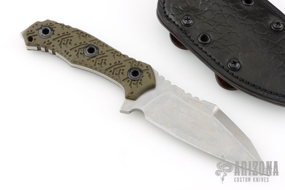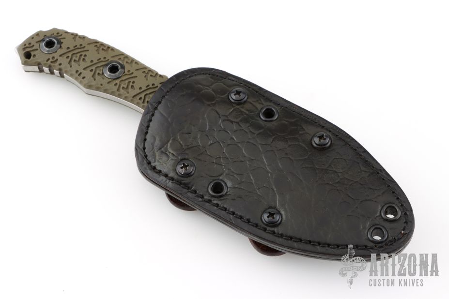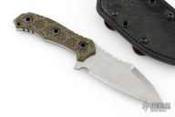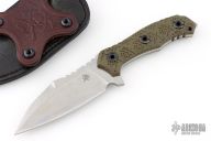 This Colubris by American Kami features a tumbled blade with notched thumbrest, .182" blade stock and 1.505" blade depth, full tang construction. Green G-10 milled scales. Comes with a black leather covered Kydex sheath by RMJ Tactical. Excellent condition.