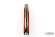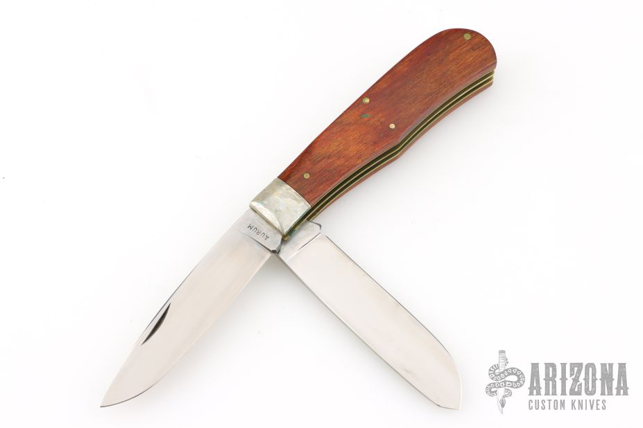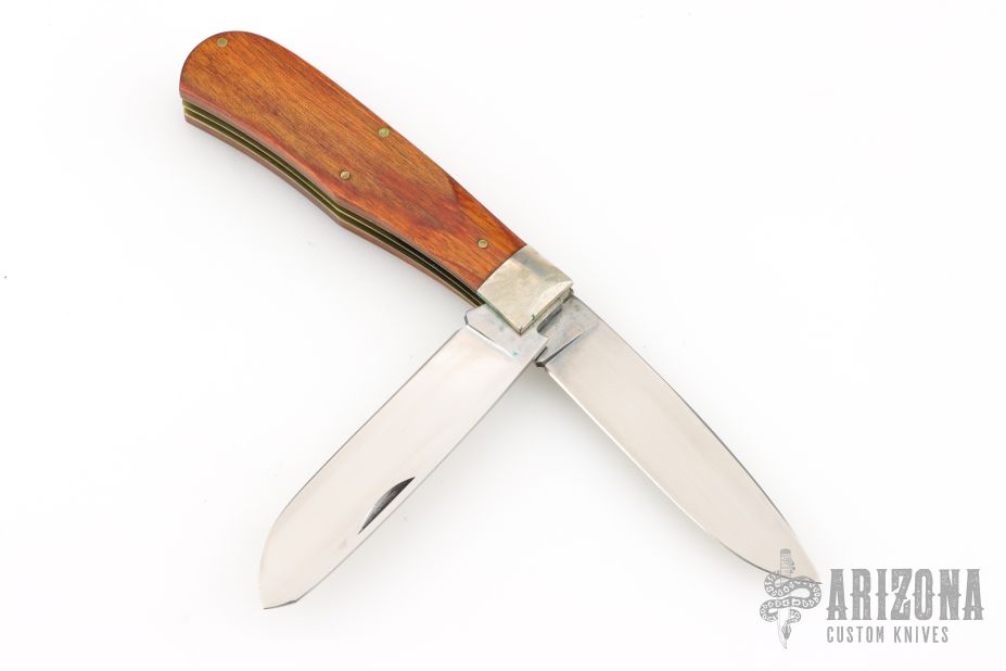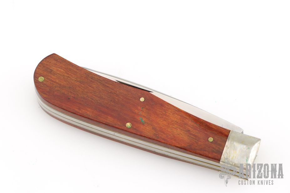 This trapper slipjoint by Alcas features mirror polished blades with nail nicks. The handle has nickel silver bolsters, dymondwood covers, brass liners and stainless steel springs. Comes with original box and brown leather sheath. Has a few light scratches, otherwise excellent condition.