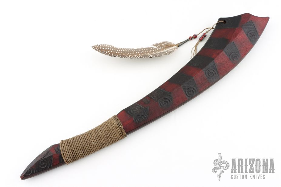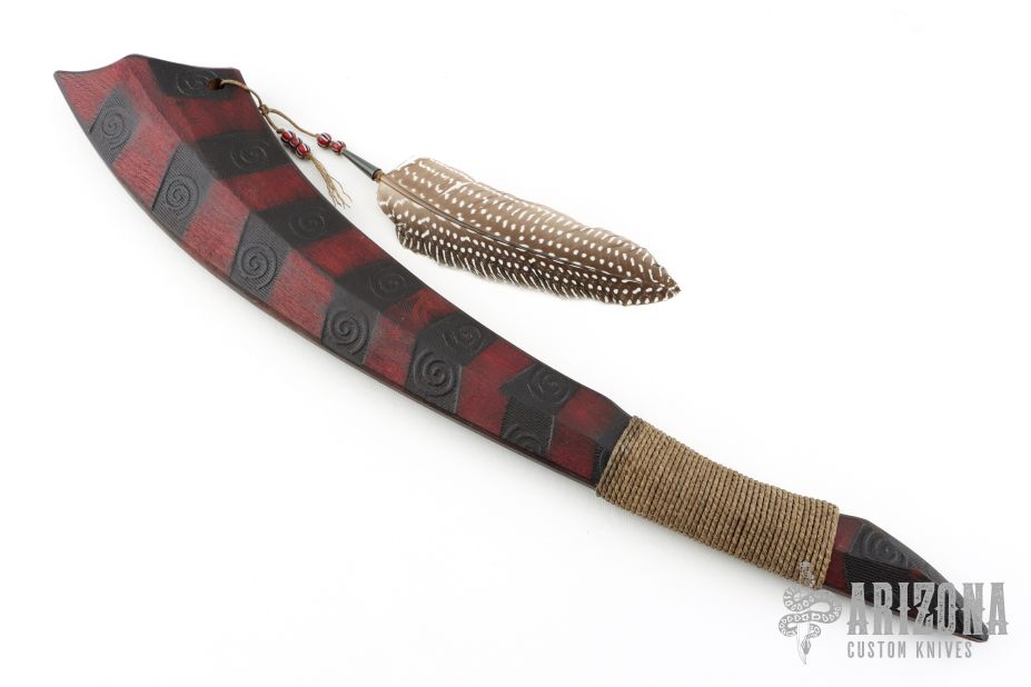 Straight from Ryan's shop is his take on the Red Stick war club! Inspired by the Creek warriors. Ryan took the theme and ran with it! His Red Stick Club is constructed from straight-grained hard wood with fire branded swirls down the length of it. The main body features a long sweeping profile with a cord wrapped handle and features a feather and ornate beads. These Red Stick War Club Saps are not for the faint of heart!