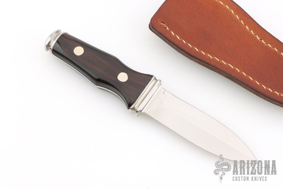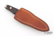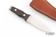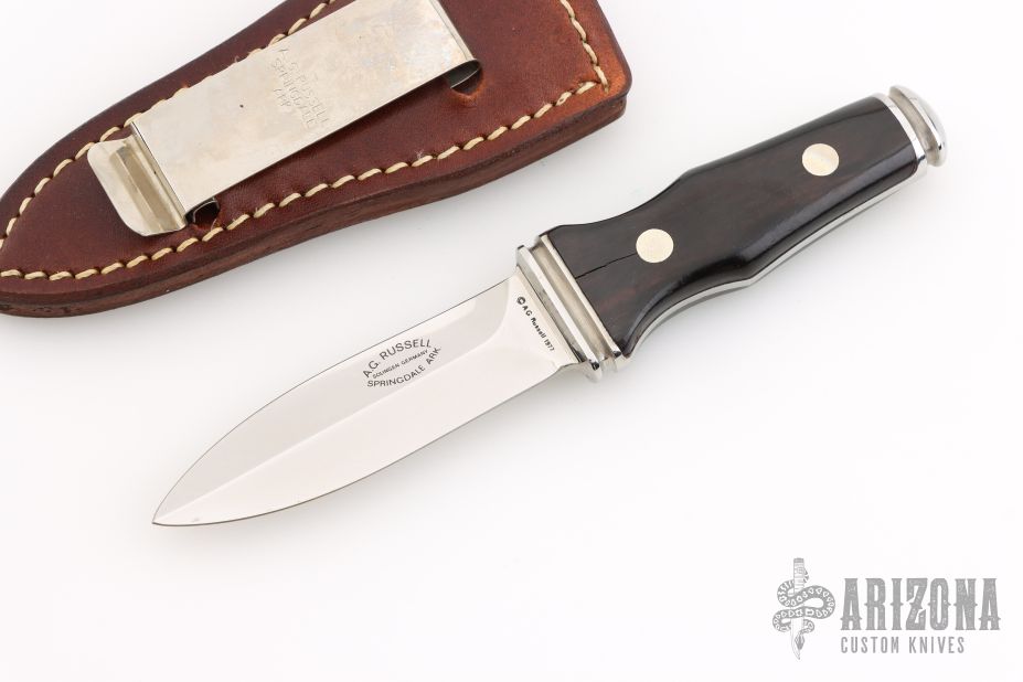 This is a very attractive boot knife from AG Russell. This is the older model made in Solingen, Germany. Blade is .162" thick and 1.083" deep at the ricasso and double-edged. Scales are wood. Integral construction with aluminum pins. Comes with original brown leather sheath with clip. Has some light scratches, and a small crack in one of the scales. Great overall condition otherwise.