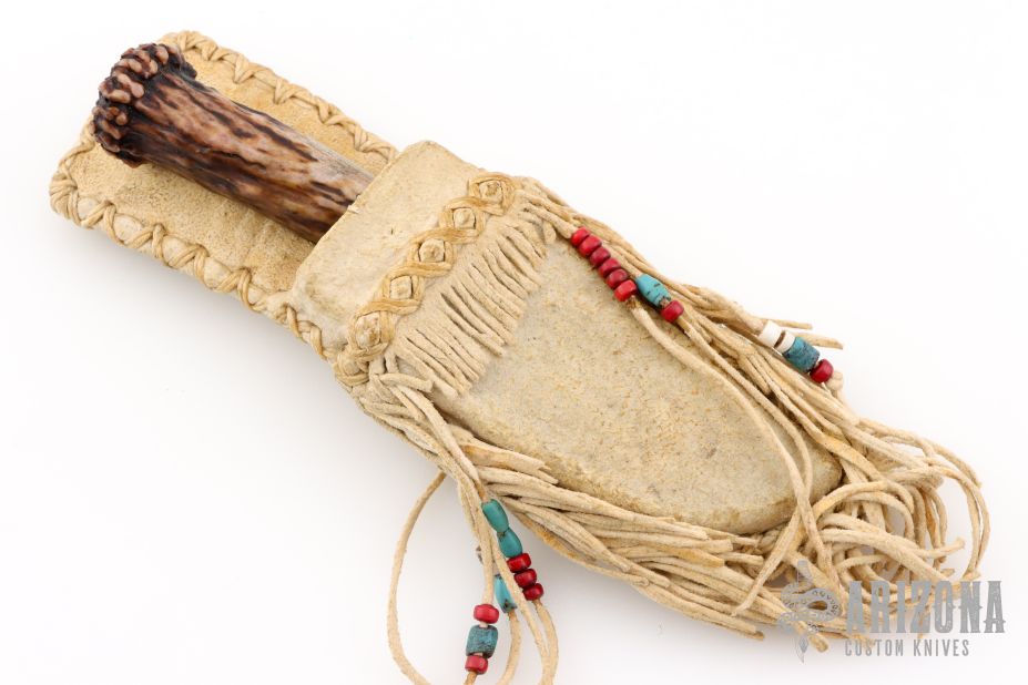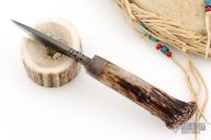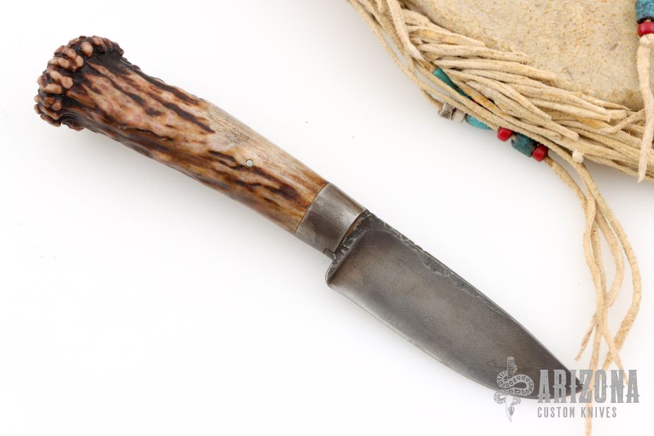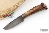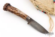 This knife by Master Smith Daniel Winkler features a hand forged drop point blade with forge finished flats and fileworked thumbrest, .213" blade stock and .822" blade depth, hidden tang construction. The handle has a steel guard and pinned crown stag grip with a carved butt. Comes with deer hide and raw hide sheath. Excellent condition. His makers mark is partially hidden under the guard. I confirmed with Daniel Winkler that he made the knife.
