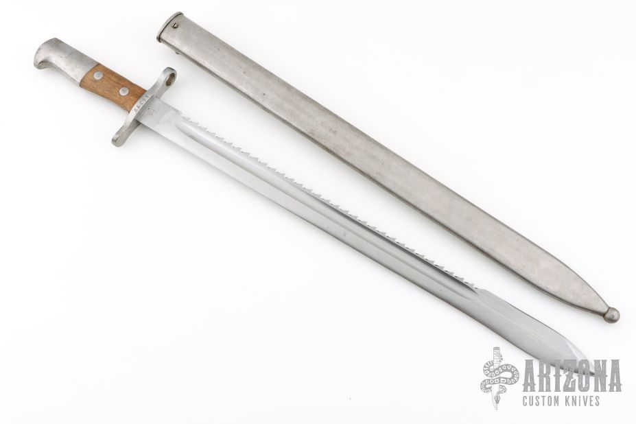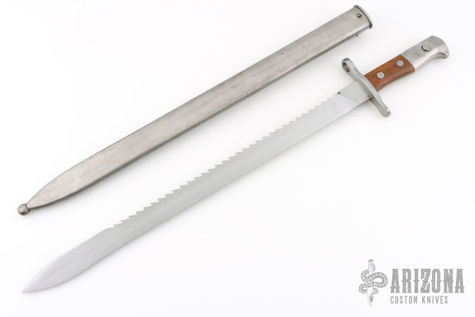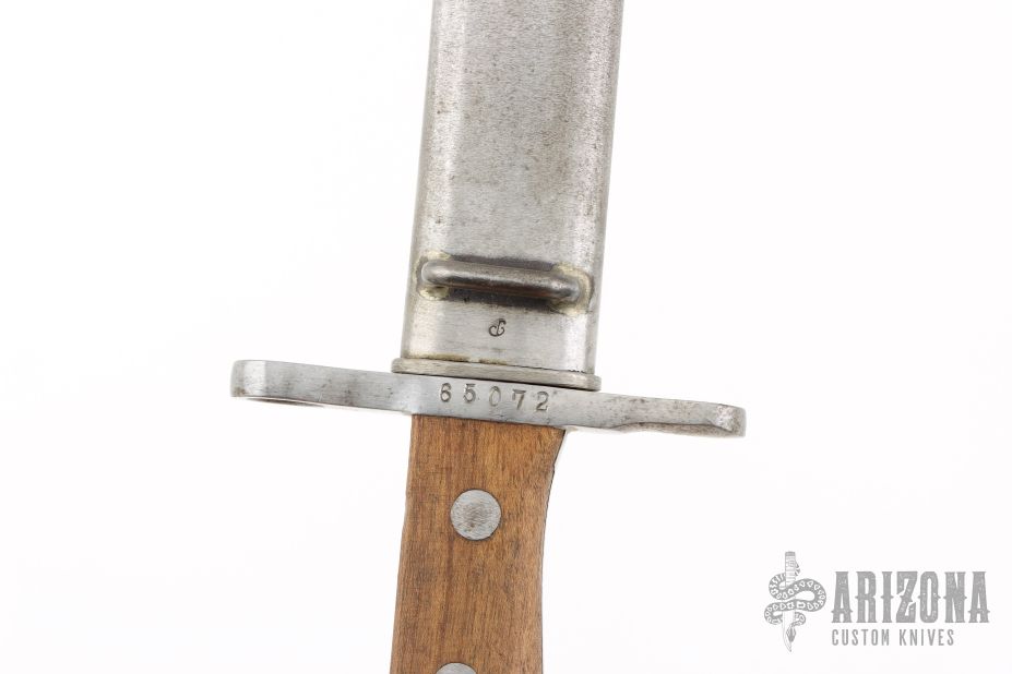 These Swiss M1914 sawback bayonets were used on 7.5mm Schmidt-Rubin M1911 Carbine and the M1931 (K31) Short Rifle. They were issued from 1916-1918. The stamped # on the crosspiece or guard was stamped (after it was issued) with soldier’s firearm #, and the bayonets were first equipped with leather sheaths. Then, from 1938, they had steel sheaths, and the defective leather sheaths were replaced. This one comes with the steel sheath and is stamped 65072 on the guard.