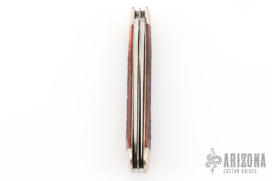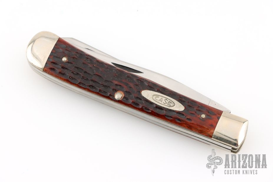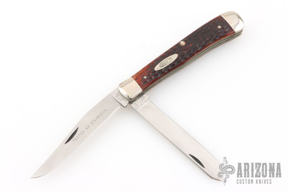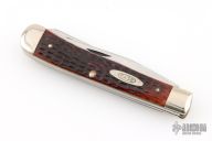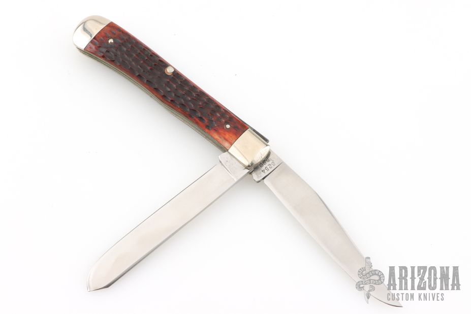 This two blade trapper by Case features two satin finished blades both with nail nicks. The handle has jigged bone covers, nickel silver bolsters and liners and stainless steel springs. Excellent condition.