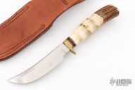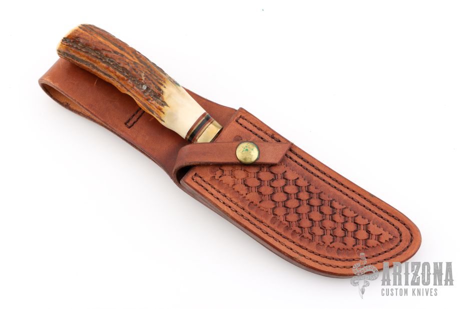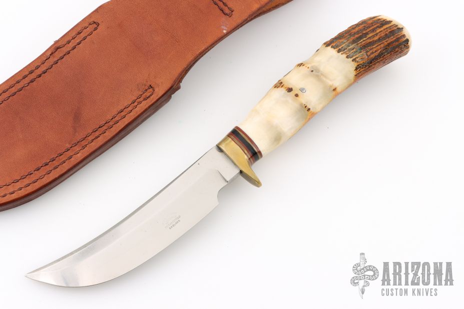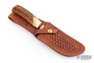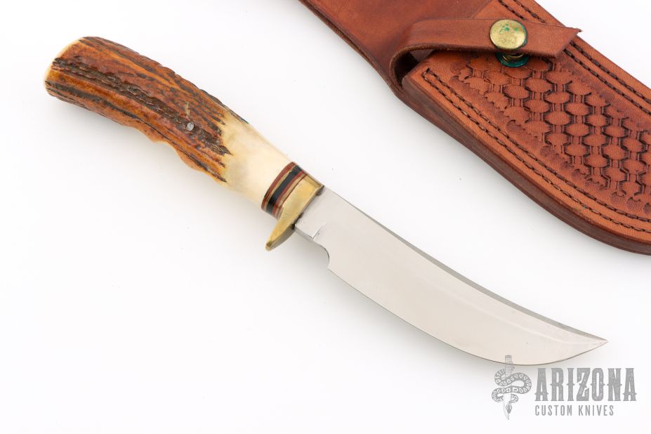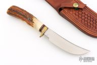 This Skinner was made in Sheffield England for Abercrombie and Fitch. It features a satin finished blade with false top edge, .203" blade stock and 1.188" blade depth, hidden tang construction. The handle has a brass guard, stag grip with right handed finger grooves, black/brass/red spacers and a steel pin. Comes with a hand tooled brown leather sheath. Has a couple light scratches, otherwise excellent condition.