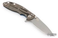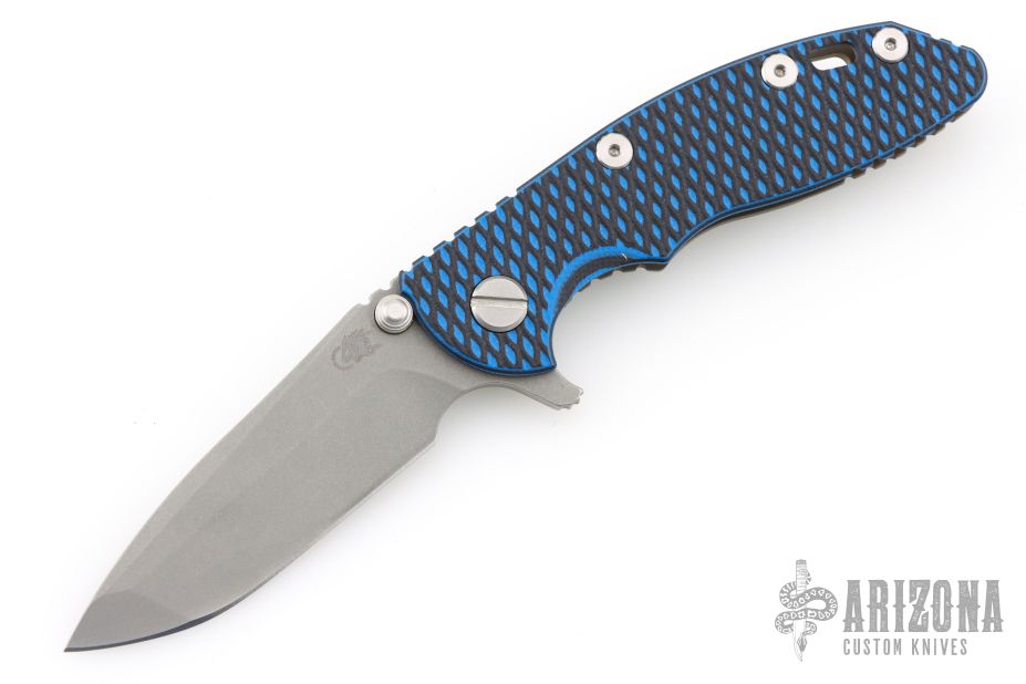 This XM-18 Flipper by Rick Hinderer Knives features bead blast finished blade, notched thumbrest and flipper, dual thumbstuds. The handle has a black/blue G-10 scale, and a battle bronze titanium handle and satin finished hardware, and titanium clip. Clip can be mounted for tip up or down carry. Nice lockup, seating, and detent. Comes with original box and extra washers. The listing also includes a black G1- MEFP scale. Excellent condition.