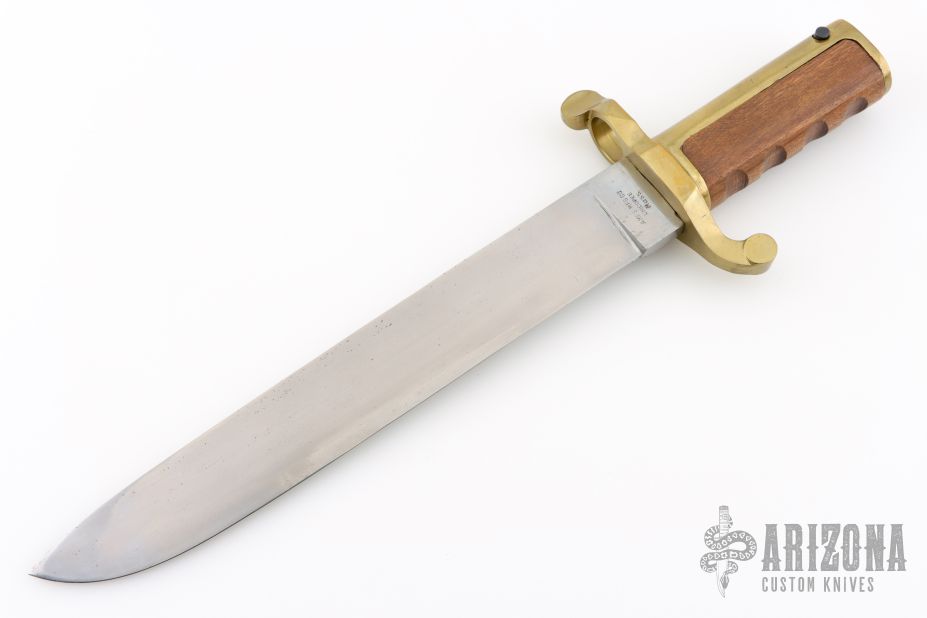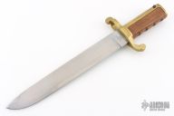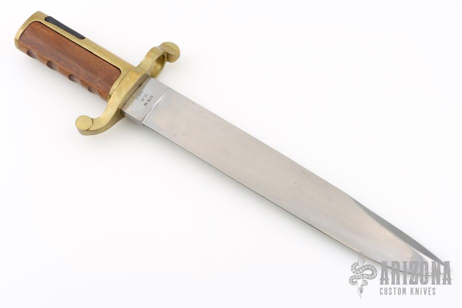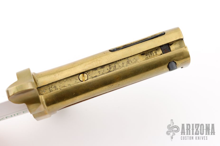 Very Good Condition of this US Navy "Dahlgren" Bowie Bayonet so-called because it was named after Admiral Dahlgren who designed this weapon.  Cast brass and wooden grip. Markings include: U.S.N, D.R. and 1862 on the obverse side of the blade. Ames MFGCo, Chicopee, Mass stamped on the reverse side. It has a satin finished blade with a full flat grind, .355" blade stock and 1.642" blade depth, hidden tang construction. Has some light scratches throughout, otherwise excellent condition for its age. Stamped JAPAN on the handle.