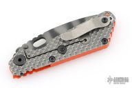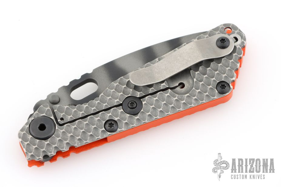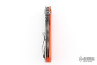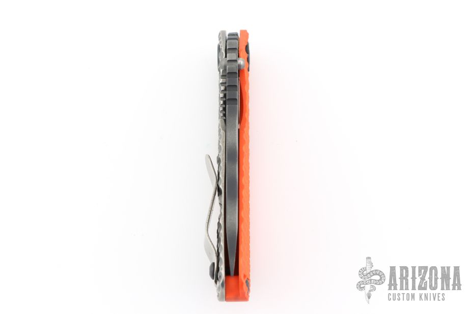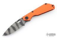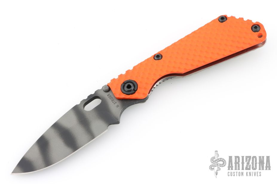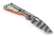 This SNG GG by Strider has a tiger stripped spear point blade with dual thumb studs, thumbhole, and notched thumb rest. Handle is orange G10 and titanium frame, with lockbar stabilizer and a matching tip up clip. Nice detent, lockup and blade seating. New condition. Comes with a zippered case.