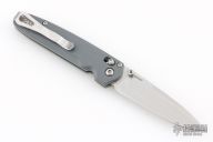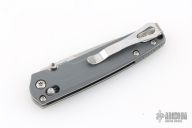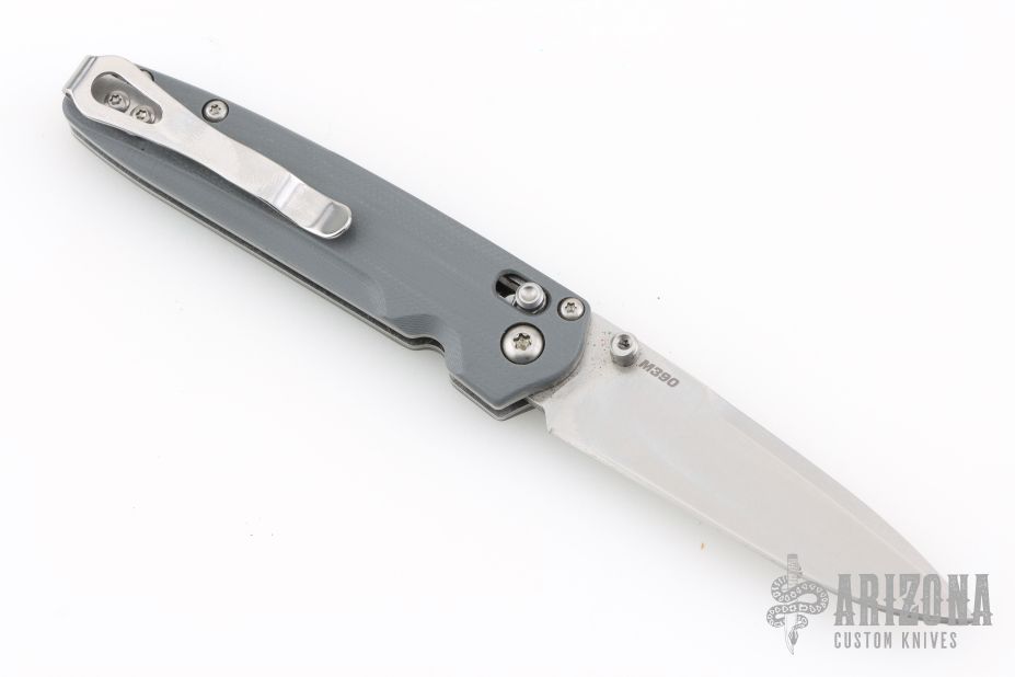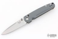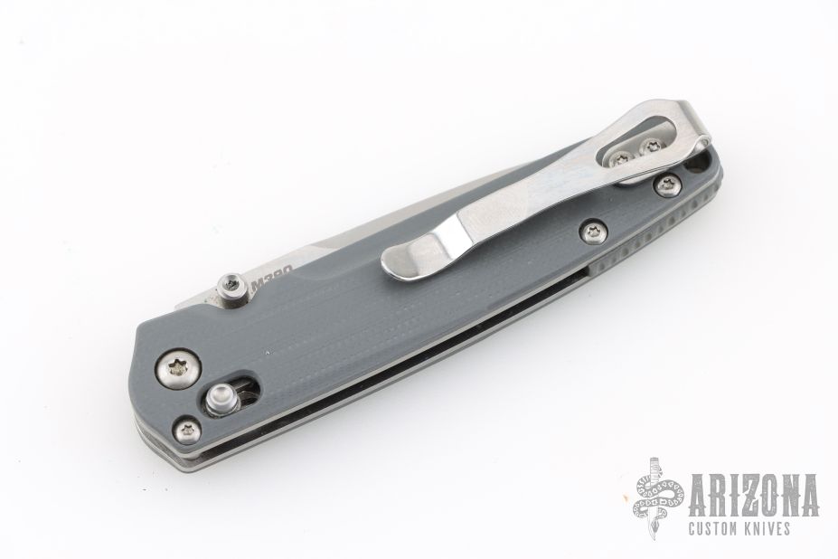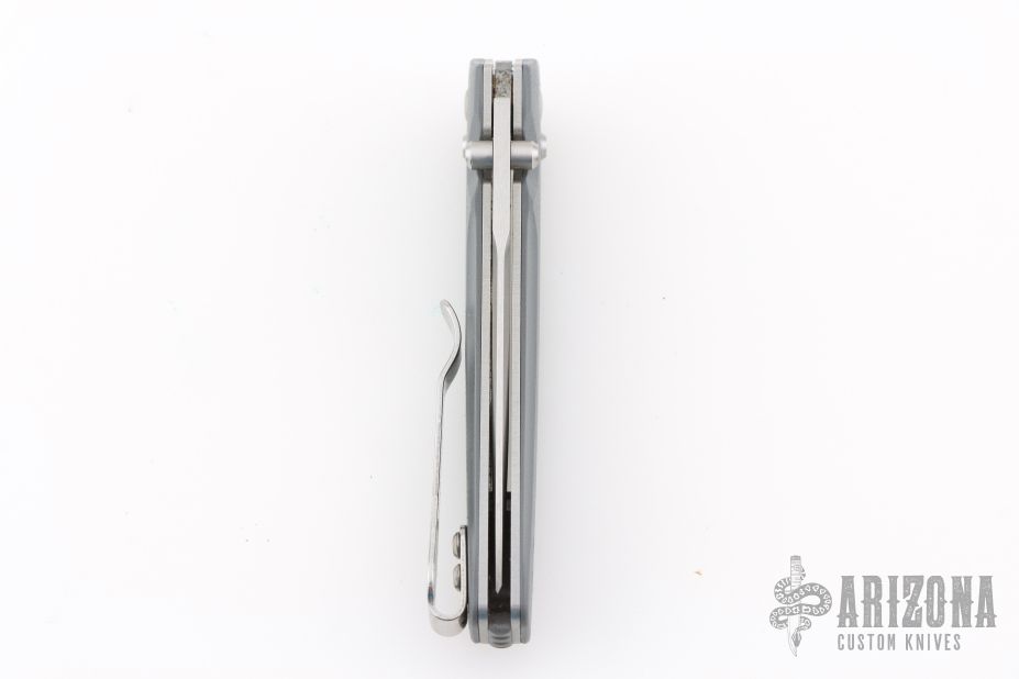 This 485 Valet by Benchmade features a tumble finished drop point blade with swedge and dual thumb studs. The handle is comprised of gray G10 over steel liners. Lanyard hole in pommel and the deep carry clip is reversible for left or right hand tip up carry. Comes with original box, pouch, and papers. Has a couple light scuffs, excellent condition otherwise.