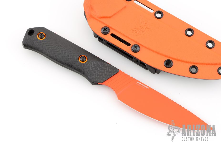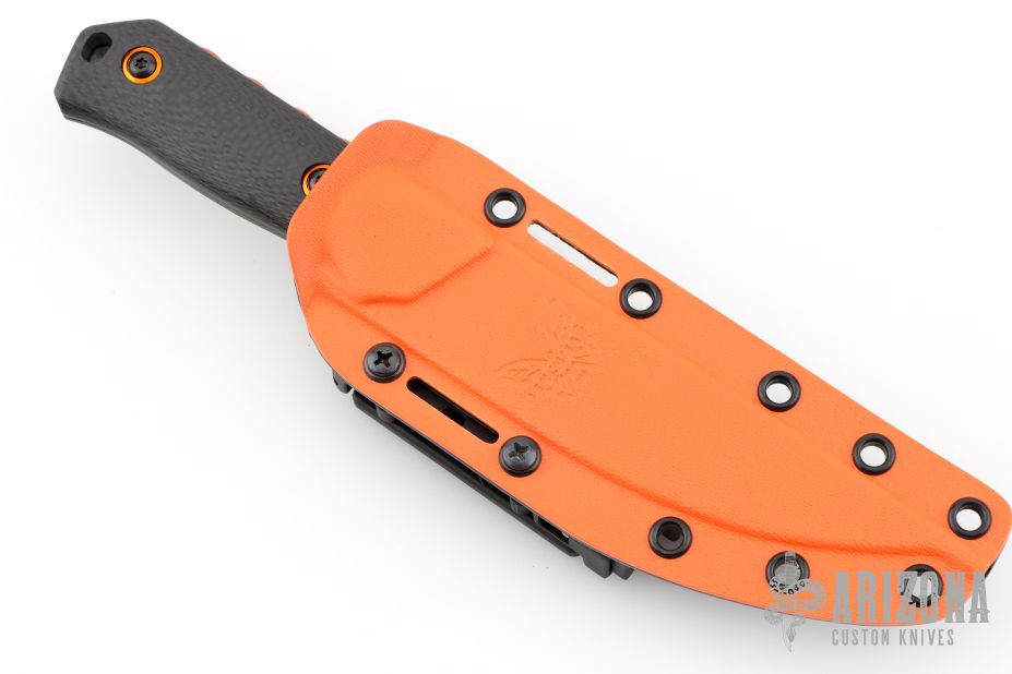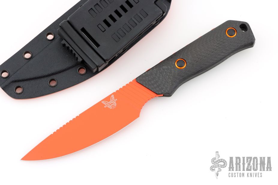 The Benchmade Raghorn is a full-sized fixed blade knife made for hunting and camping. Its lightweight handle and large finger choil facilitate several grips and excellent maneuverability. The steel of its blade is known for its extreme toughness and edge retention, and with its orange coating, you won't have to worry about losing the knife if you drop it in the woods. It includes a Boltraron sheath for belt carry.