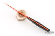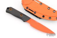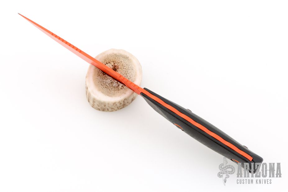 - CPM CRU-WEAR carbon steel blade with spine jimping and an orange coating.